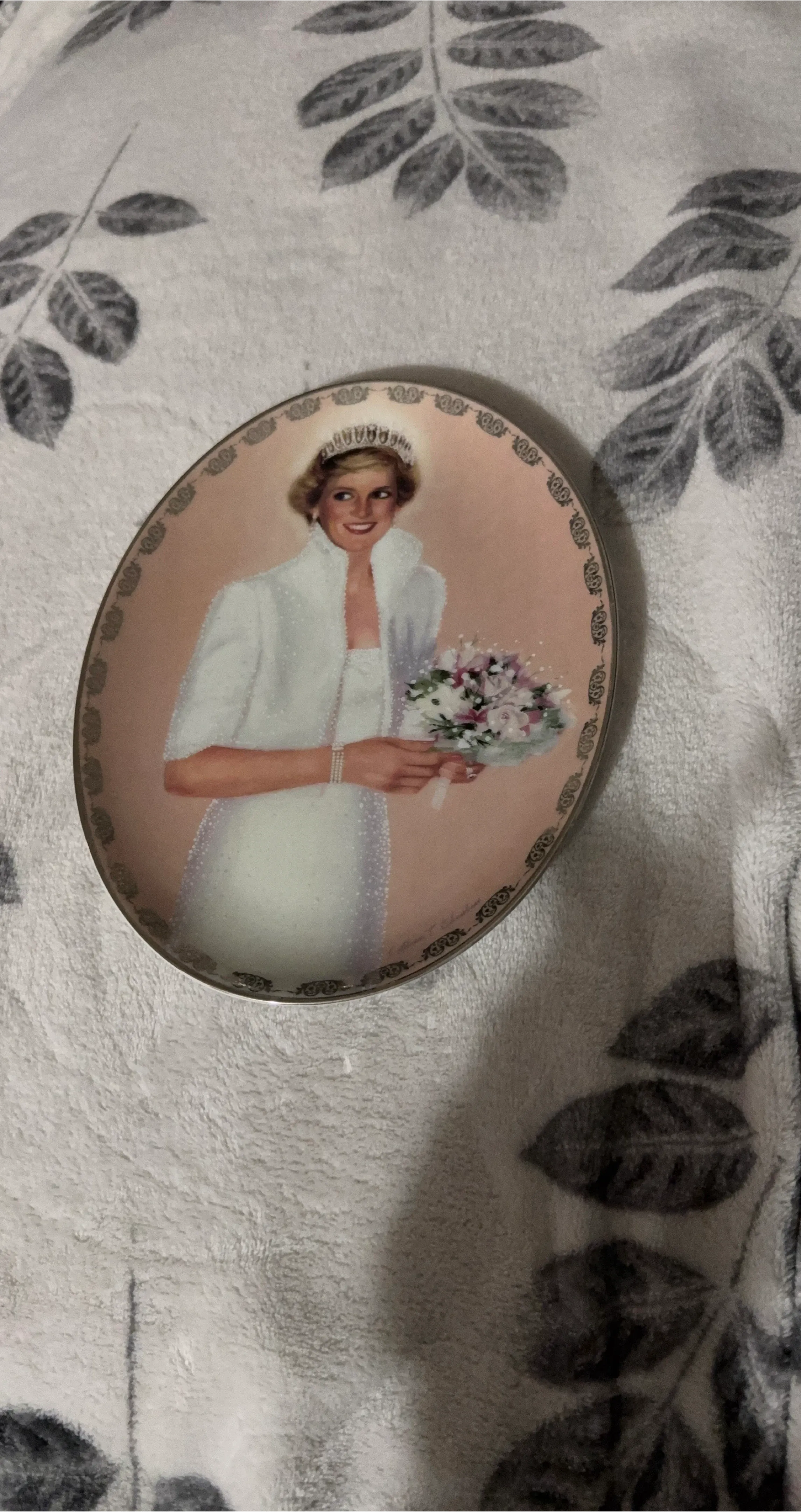 This is a collector plate featuring Princess Diana. It depicts her in a wedding dress with a tiara and holding a bouquet. It's a decorative piece for display.