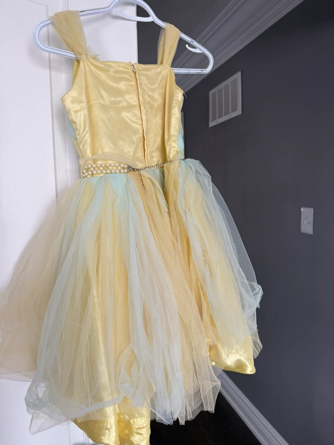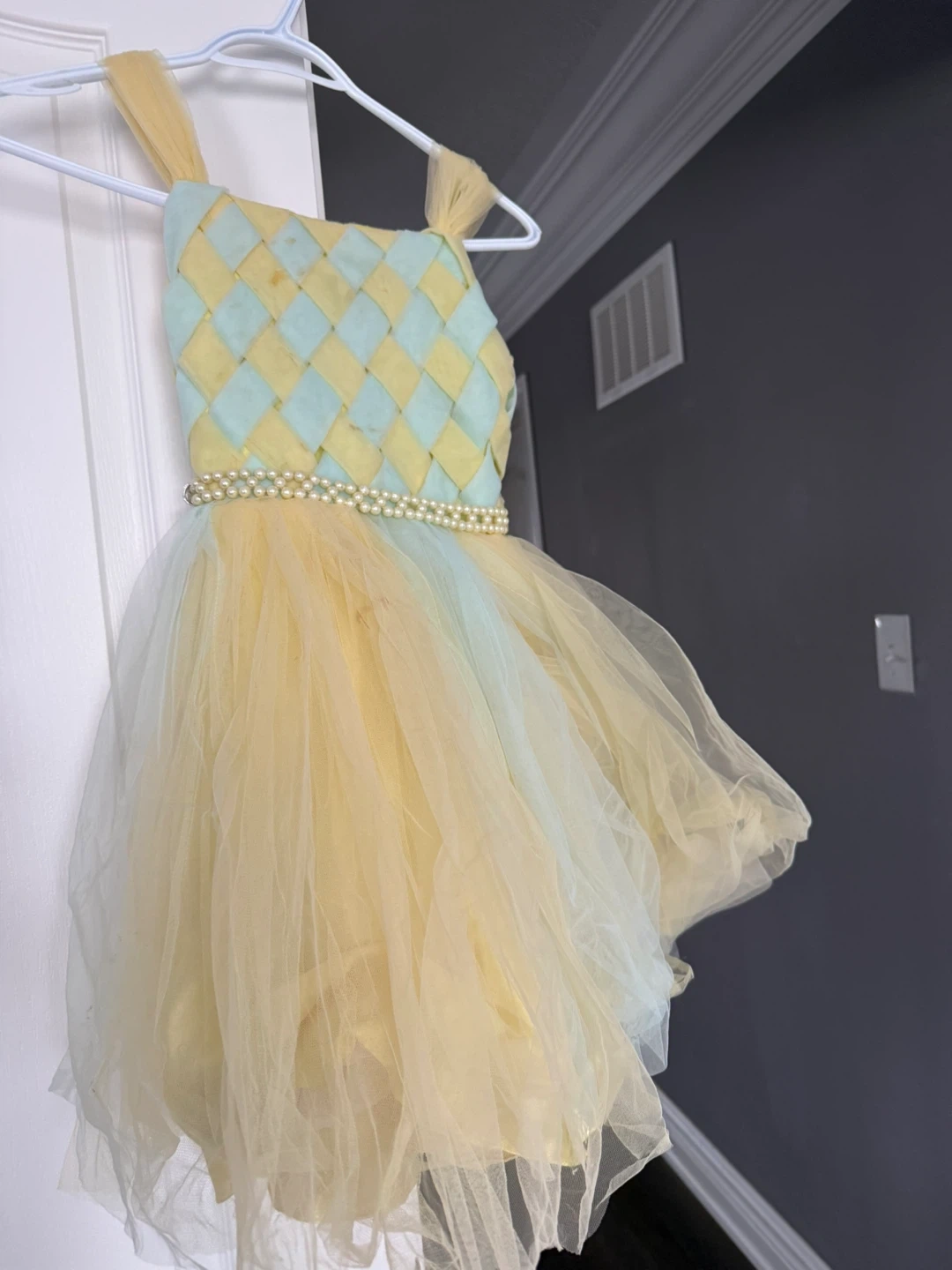 This adorable girls' dress features a yellow satin bodice with a pastel green and yellow diamond pattern. It's adorned with a pearl-like beaded waistband and a full, layered tulle skirt in shades of yellow and pale green. It's perfect for parties or special occasions!