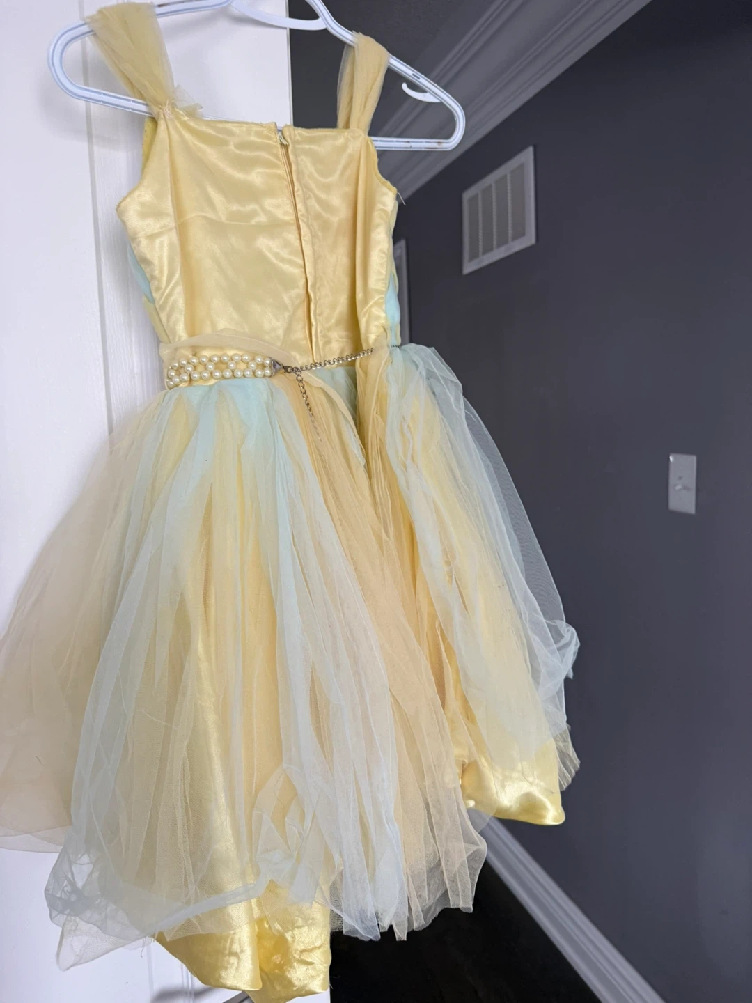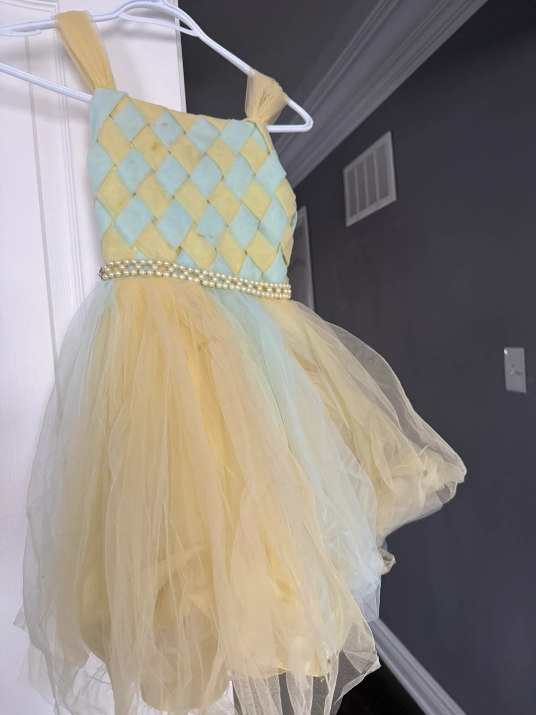 This adorable girls' dress features a yellow satin bodice with a pastel green and yellow diamond pattern. It's adorned with a pearl-like beaded waistband and a full, layered tulle skirt in shades of yellow and pale green. It's perfect for parties or special occasions!
