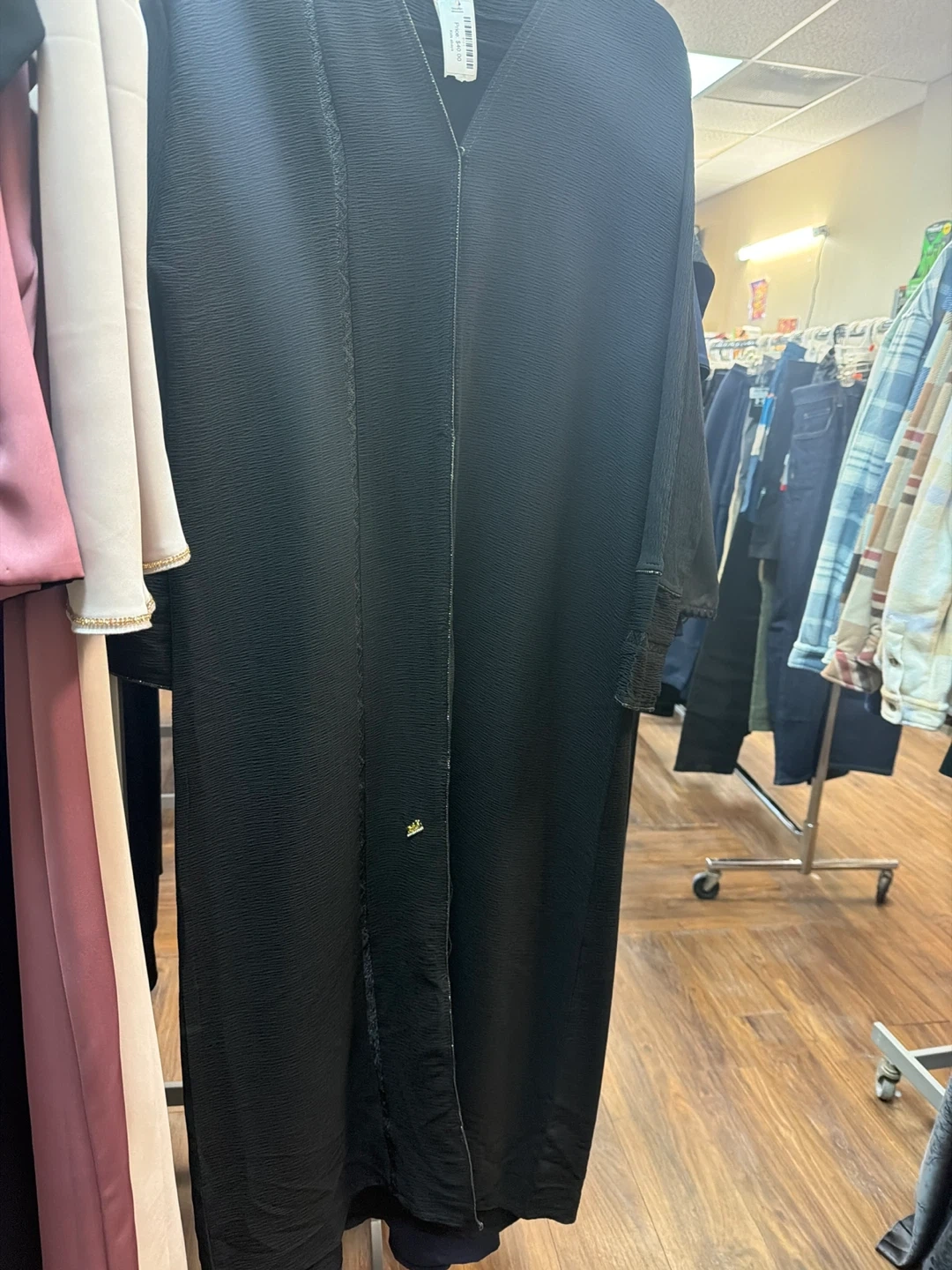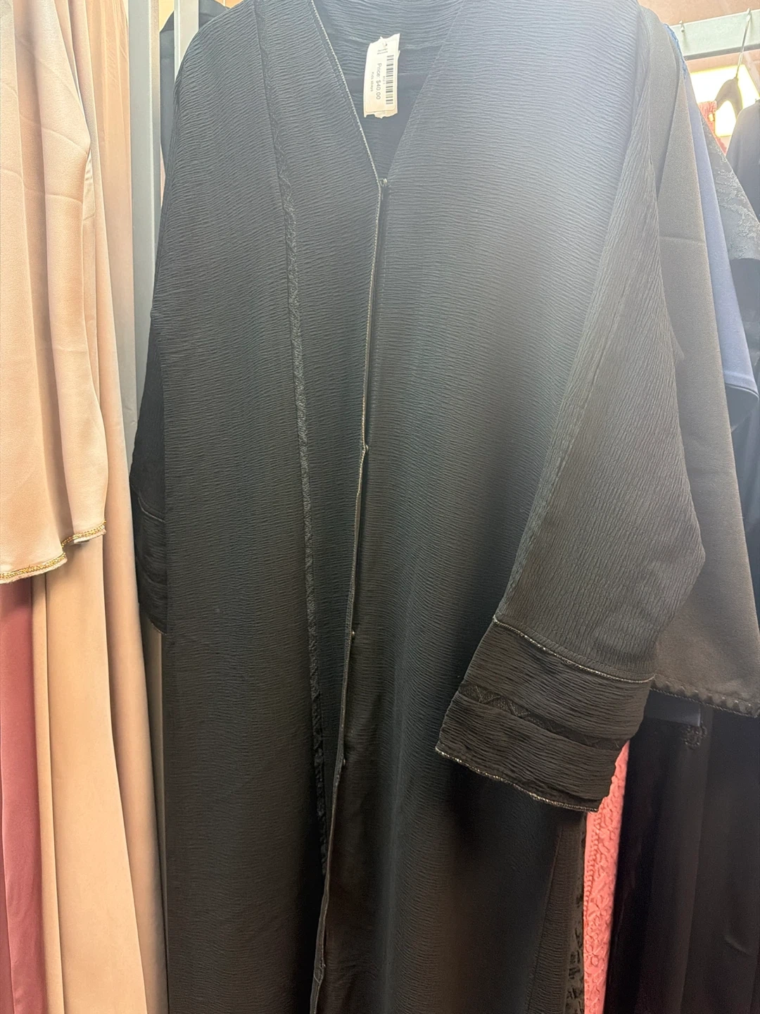 A black textured abaya featuring a front opening . It has decorative trim on the sleeves and down the front. Perfect for everyday wear or special occasions.Size 52 available made in Saudia Arabia