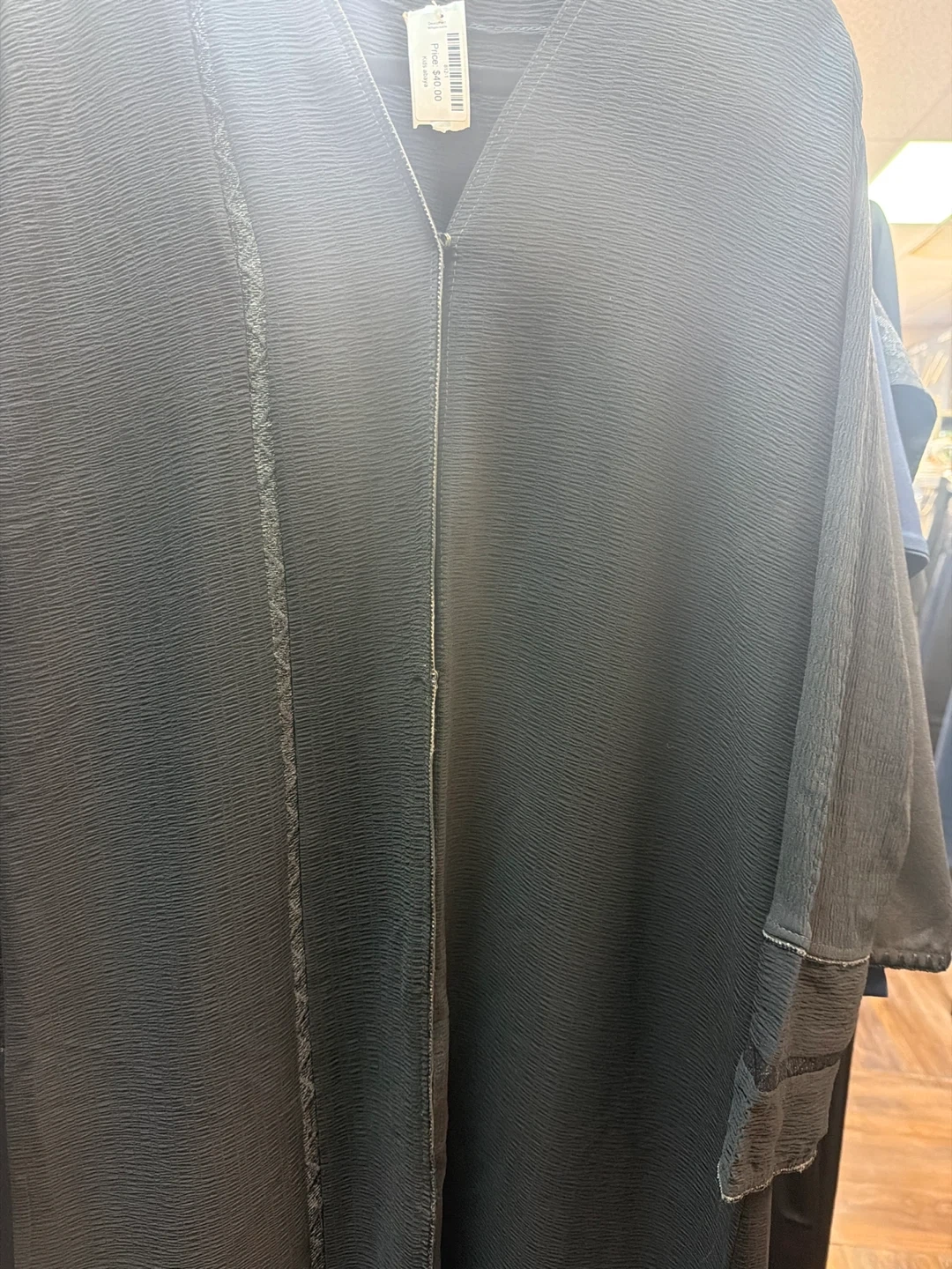 A black textured abaya featuring a front opening . It has decorative trim on the sleeves and down the front. Perfect for everyday wear or special occasions.Size 52 available made in Saudia Arabia