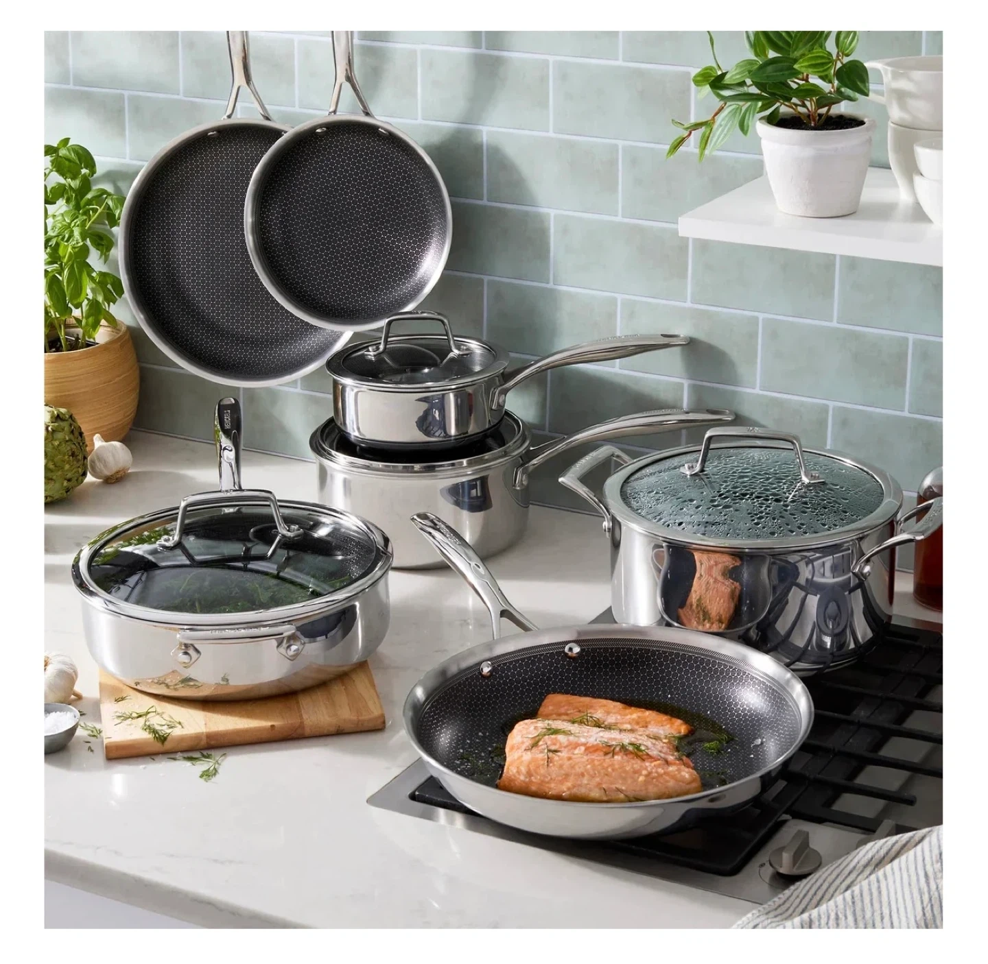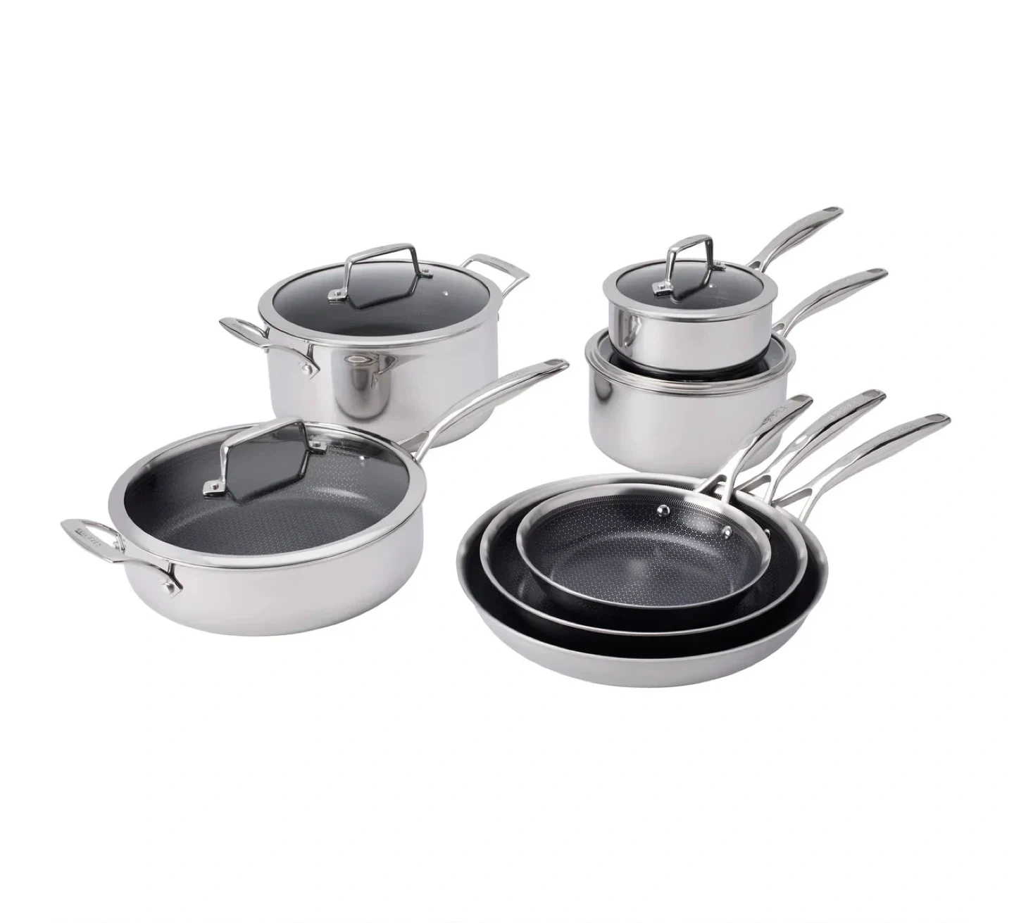 This 11-piece Henckels Paradigm cookware set features ceramic nonstick surfaces. It's constructed from durable stainless steel for even heating. The set includes pots and pans with glass lids.