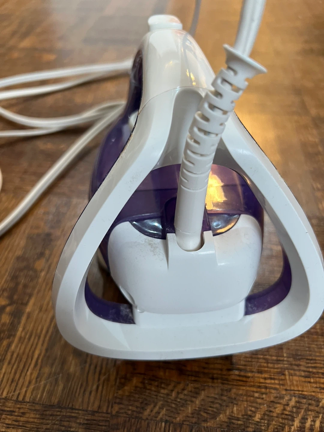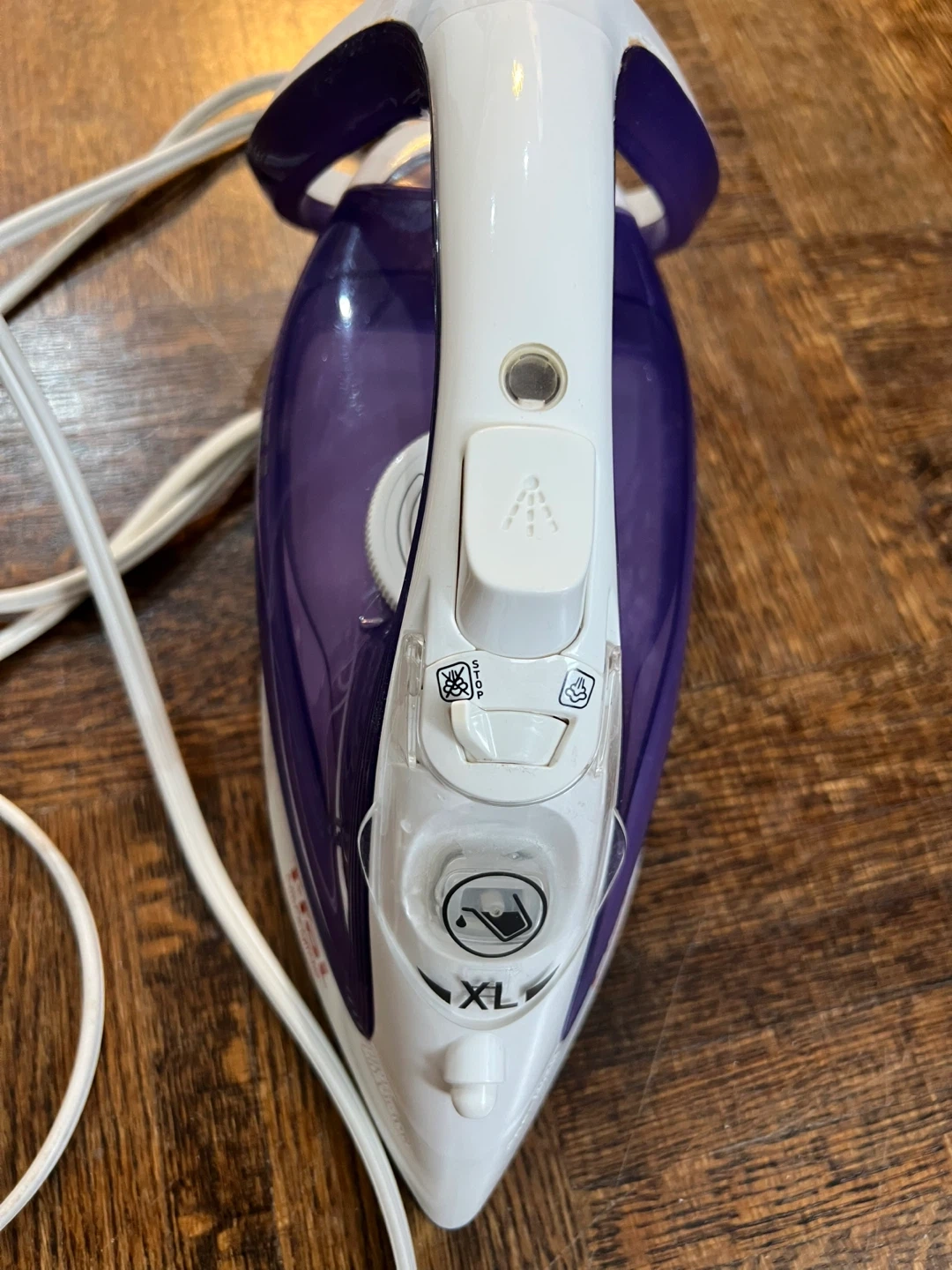 This T-fal Ultraglide iron has a purple and white design. It's suitable for various fabric settings. A handy iron for everyday use!