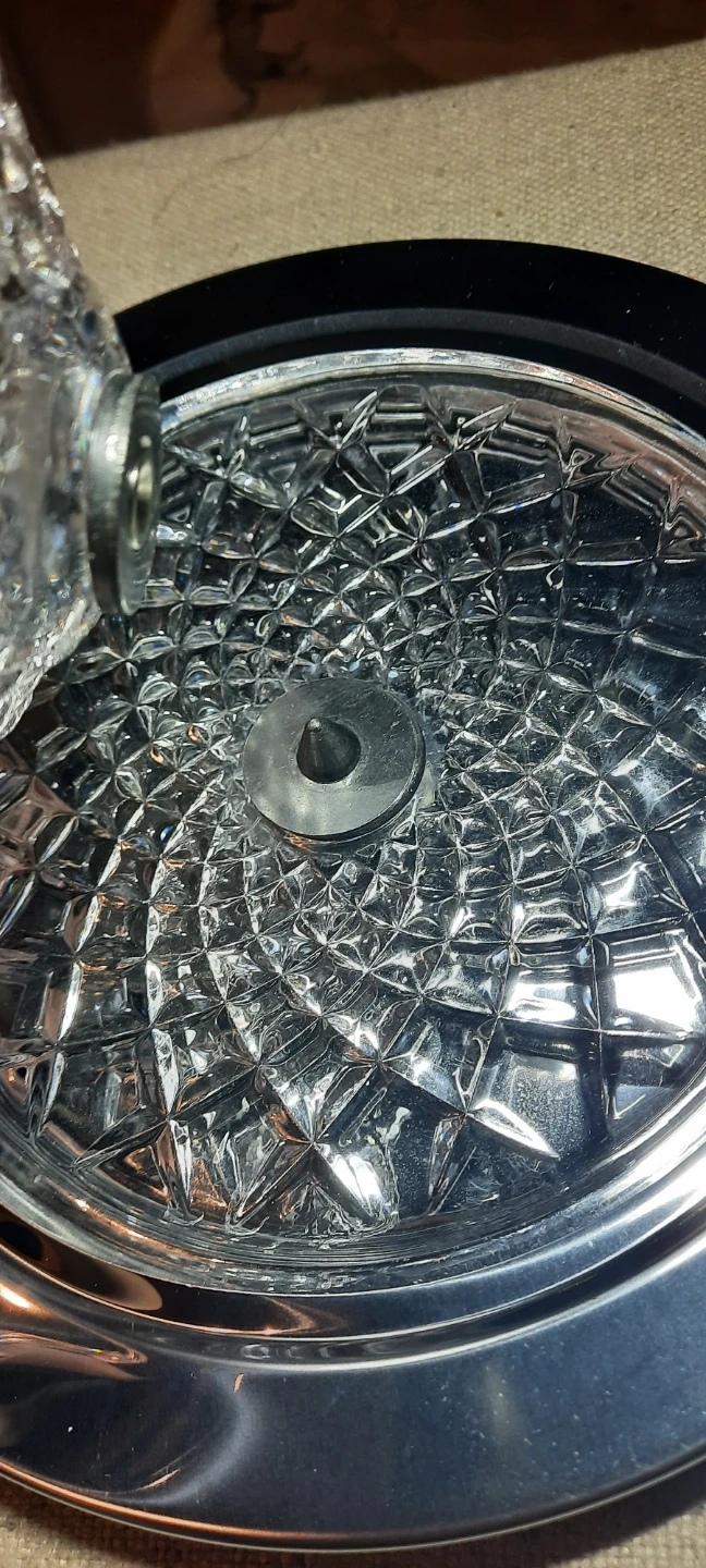 Selling a crystal rotary decanter with a silver base. It's in great condition and ready to use for your favourite beverages! The design allows for easy pouring and aeration. The base is a shiny silver colour and complements the crystal beautifully.