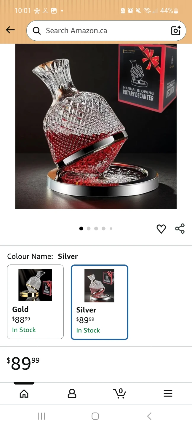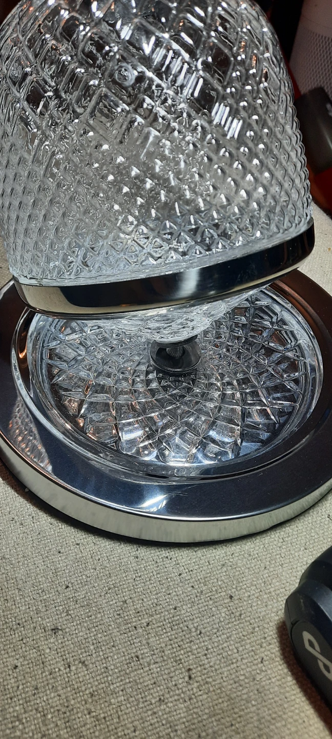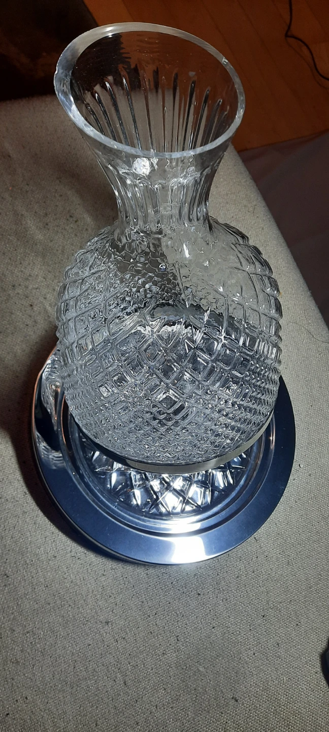 Selling a crystal rotary decanter with a silver base. It's in great condition and ready to use for your favourite beverages! The design allows for easy pouring and aeration. The base is a shiny silver colour and complements the crystal beautifully.