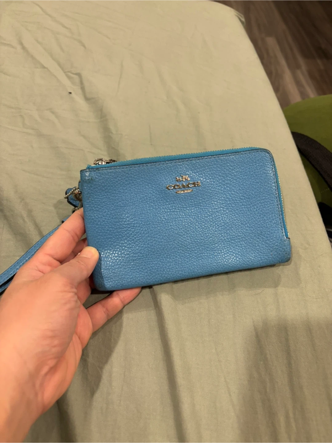 Coach wristlet in blue pebbled leather. It has a zip-around closure and a detachable wrist strap. Leather material.