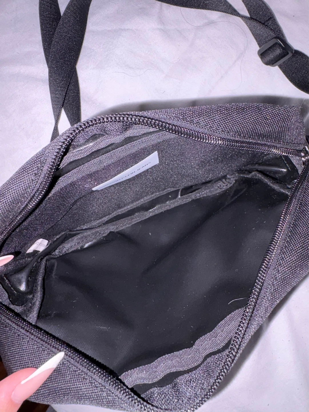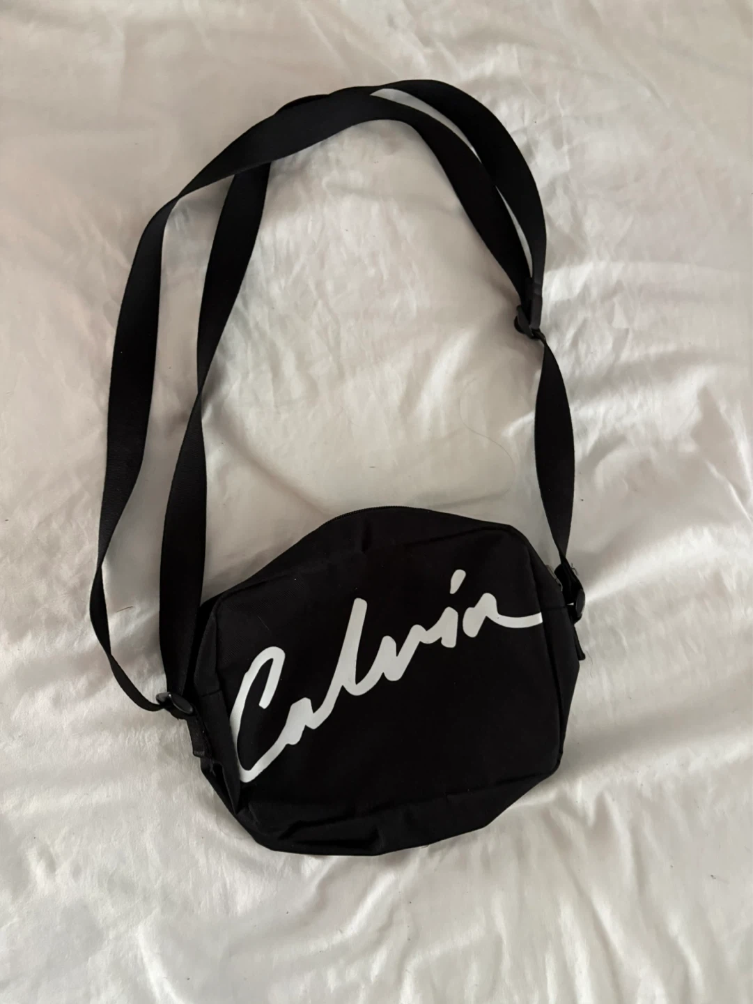 This is a black Calvin Klein crossbody bag with the brand name printed in white. It has an adjustable strap and zippered closure. The interior features a small pocket.