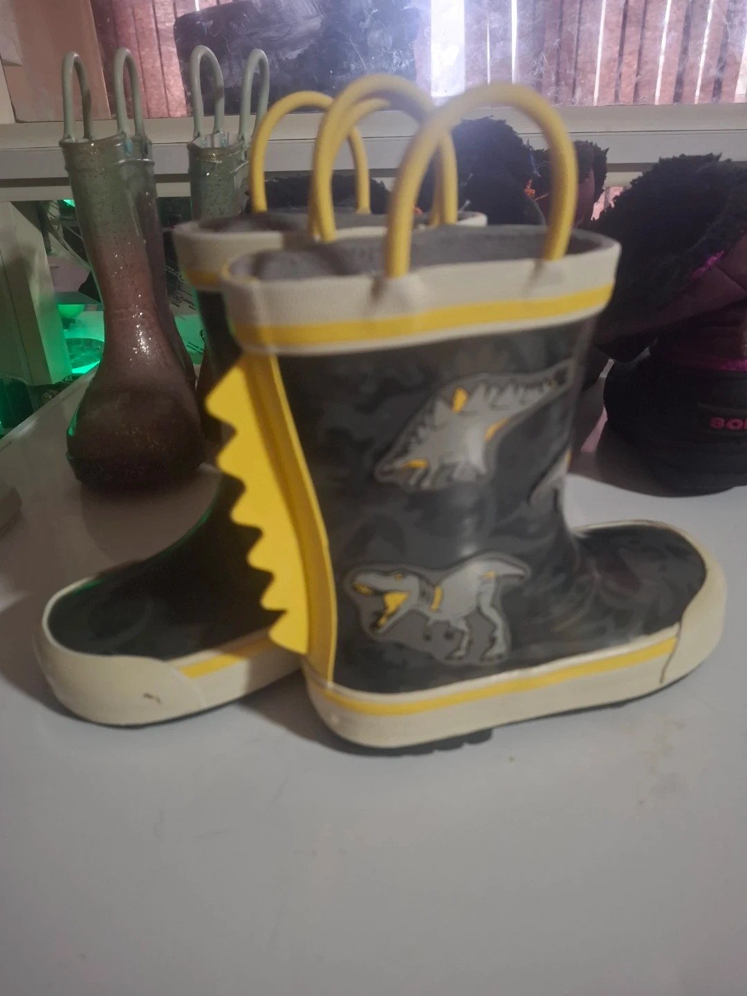 Kids' grey rain boots with a dinosaur pattern. They have yellow handles and trim. Perfect for splashing in puddles!