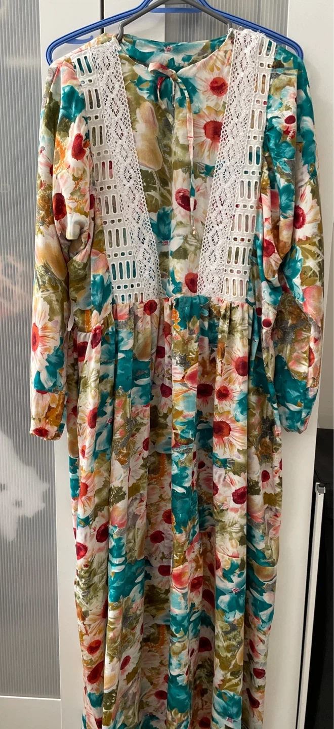 Here's a lovely floral print dress with some pretty lace detailing! The dress features a tie at the neck and long sleeves. It's perfect for adding a touch of spring to your wardrobe. It's in great condition and ready for a new home!