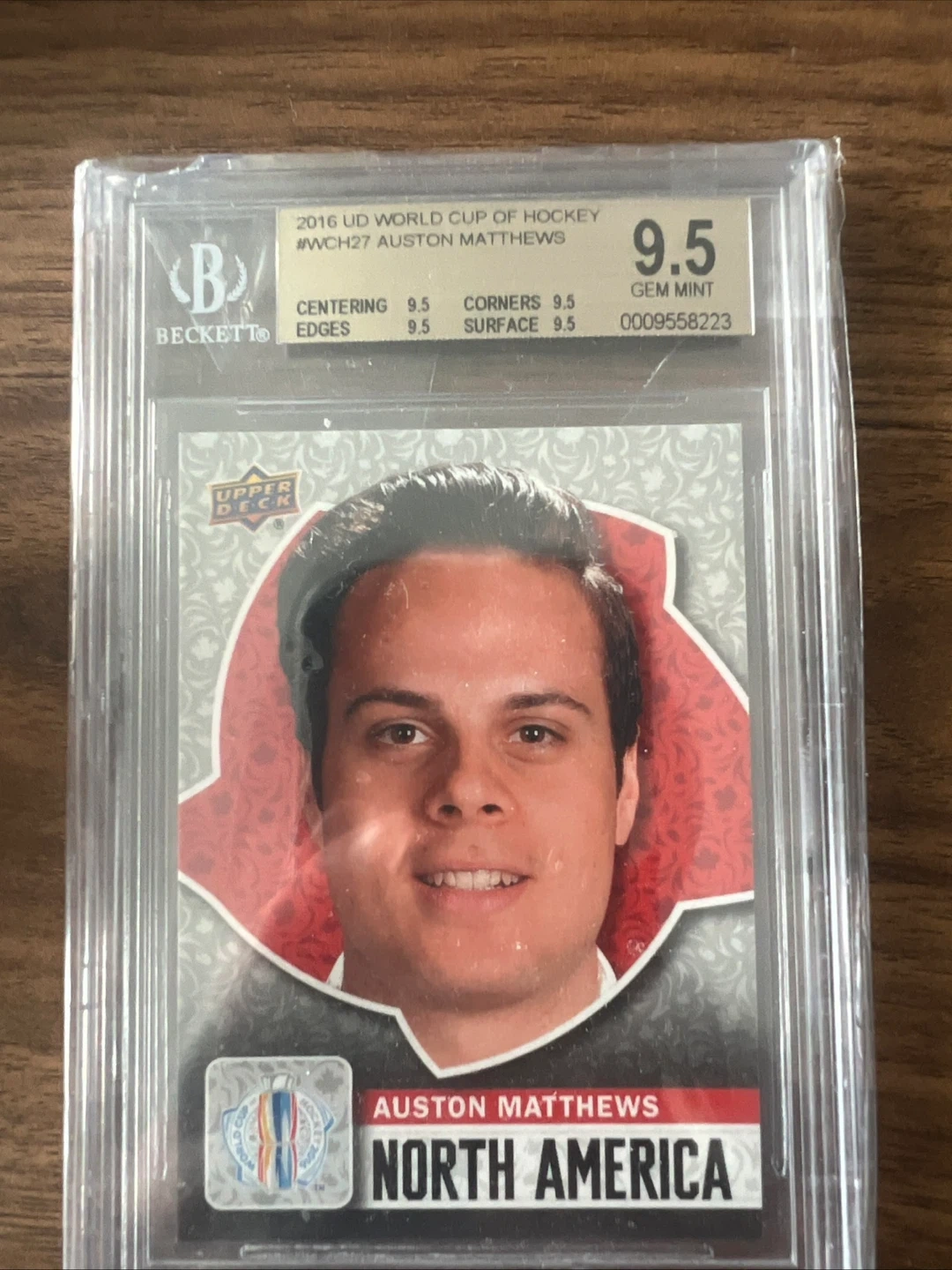 This is a 2016 Upper Deck World Cup of Hockey trading card featuring Auston Matthews. It's graded Beckett 9.5 Gem Mint. The card is #WCH27 and represents North America.