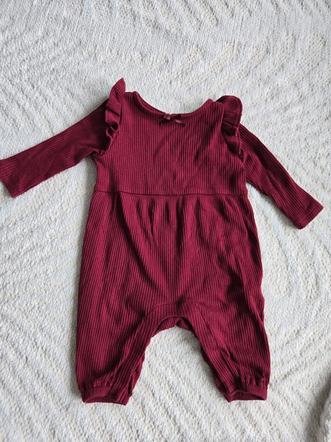 This adorable burgundy romper features a ribbed texture and long sleeves. It has cute ruffled shoulders and a tiny bow at the neckline. The elasticized leg cuffs offer a comfy fit. Perfect for holiday pictures & outings.