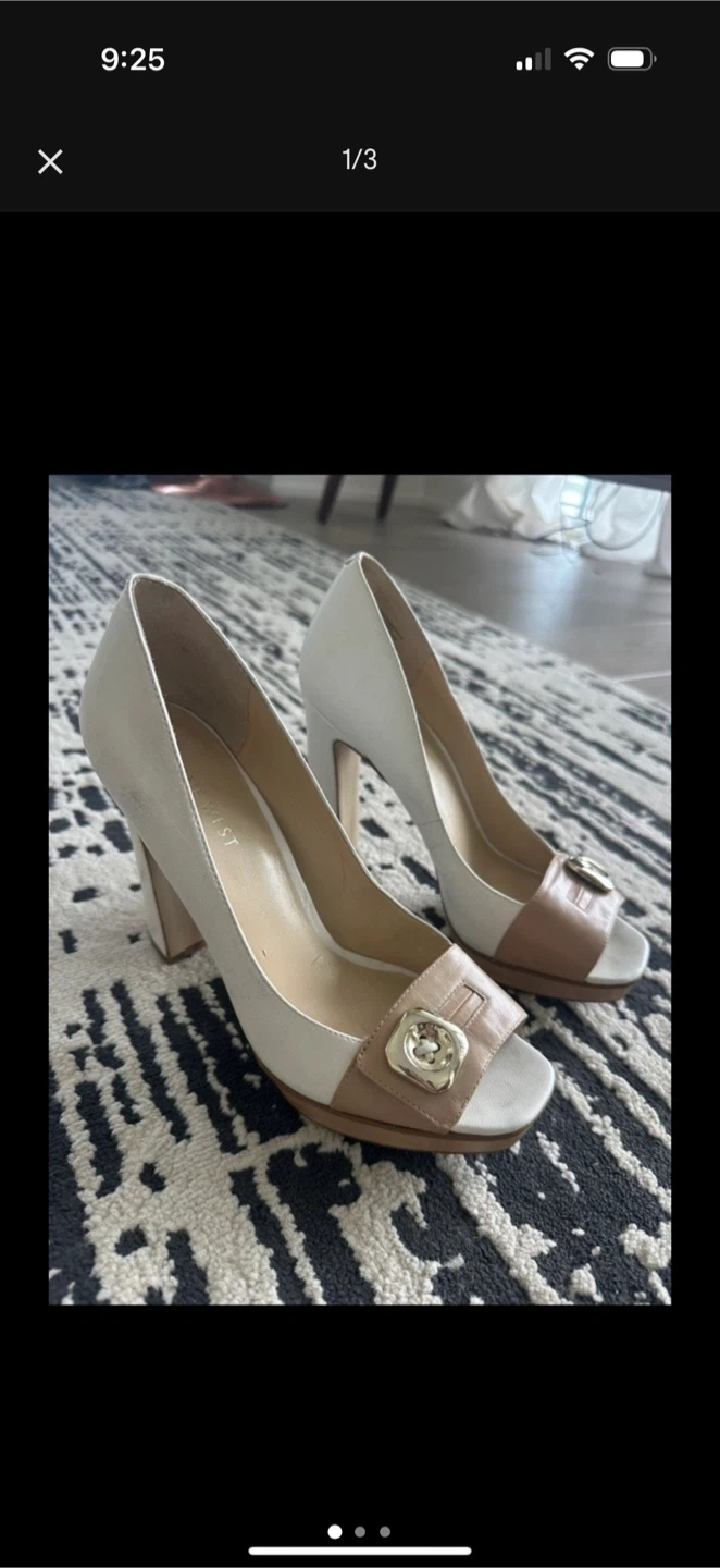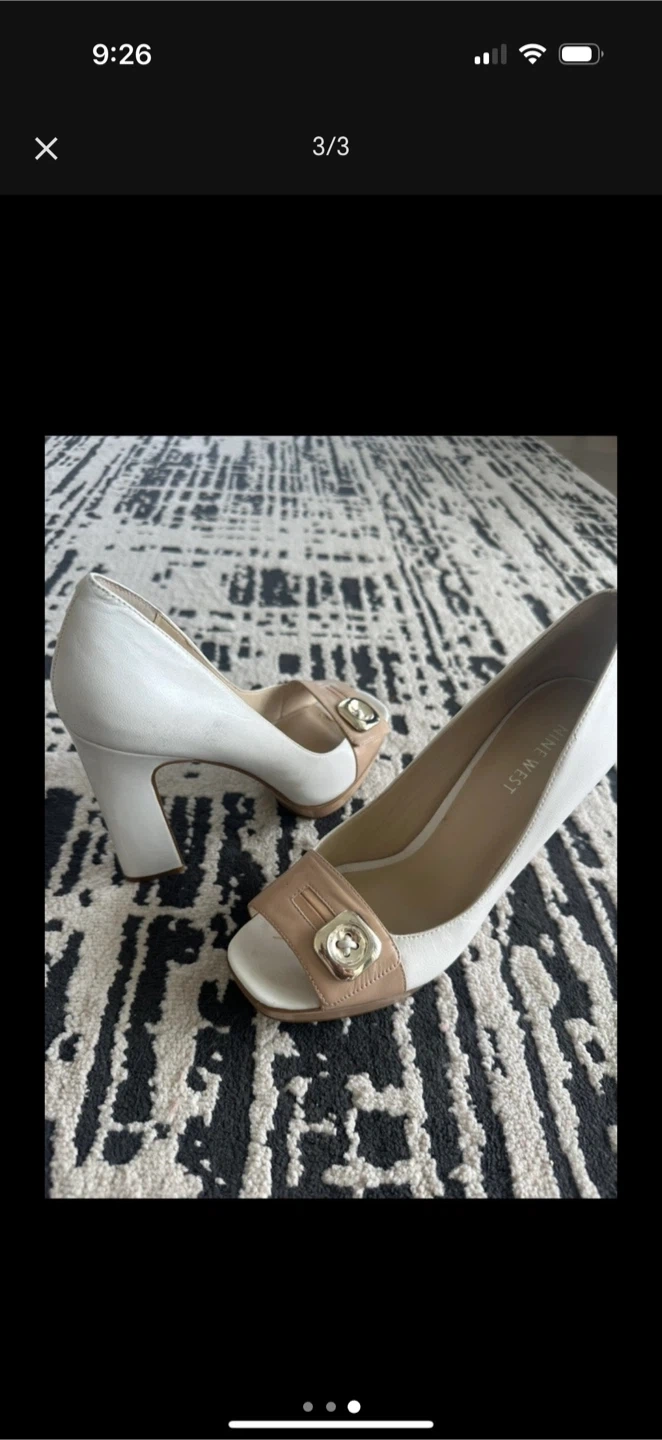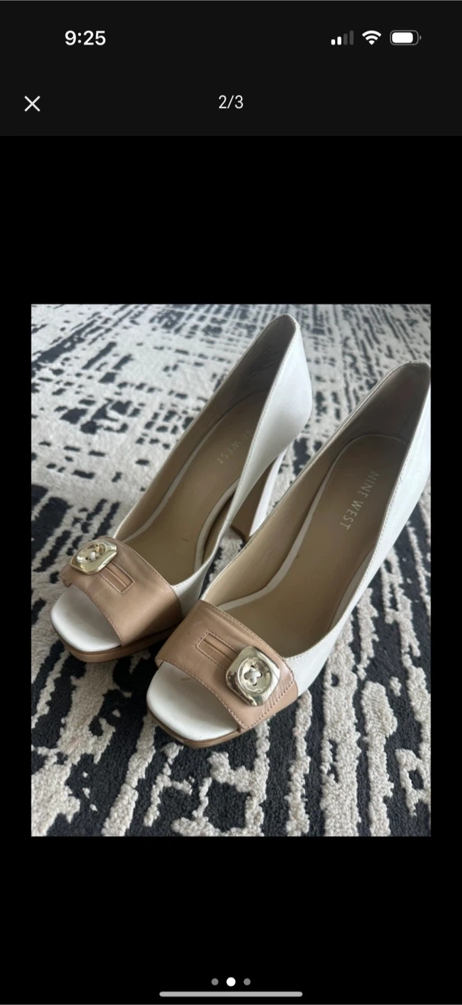 White and beige leather Nine West heels, size 7, with a chic peep-toe design and four-inch block heel. Gold-toned accents add a subtle touch of glamour.