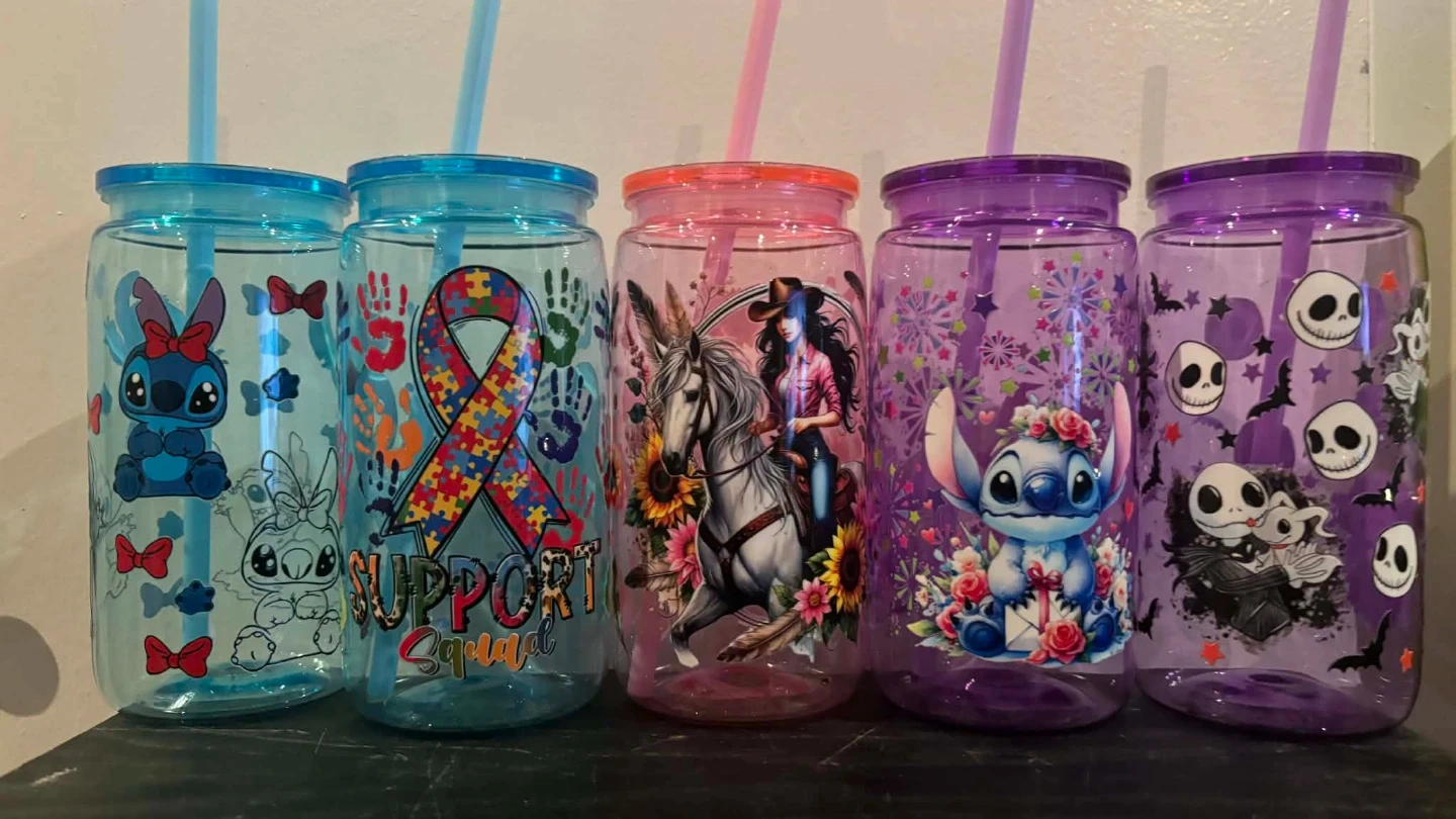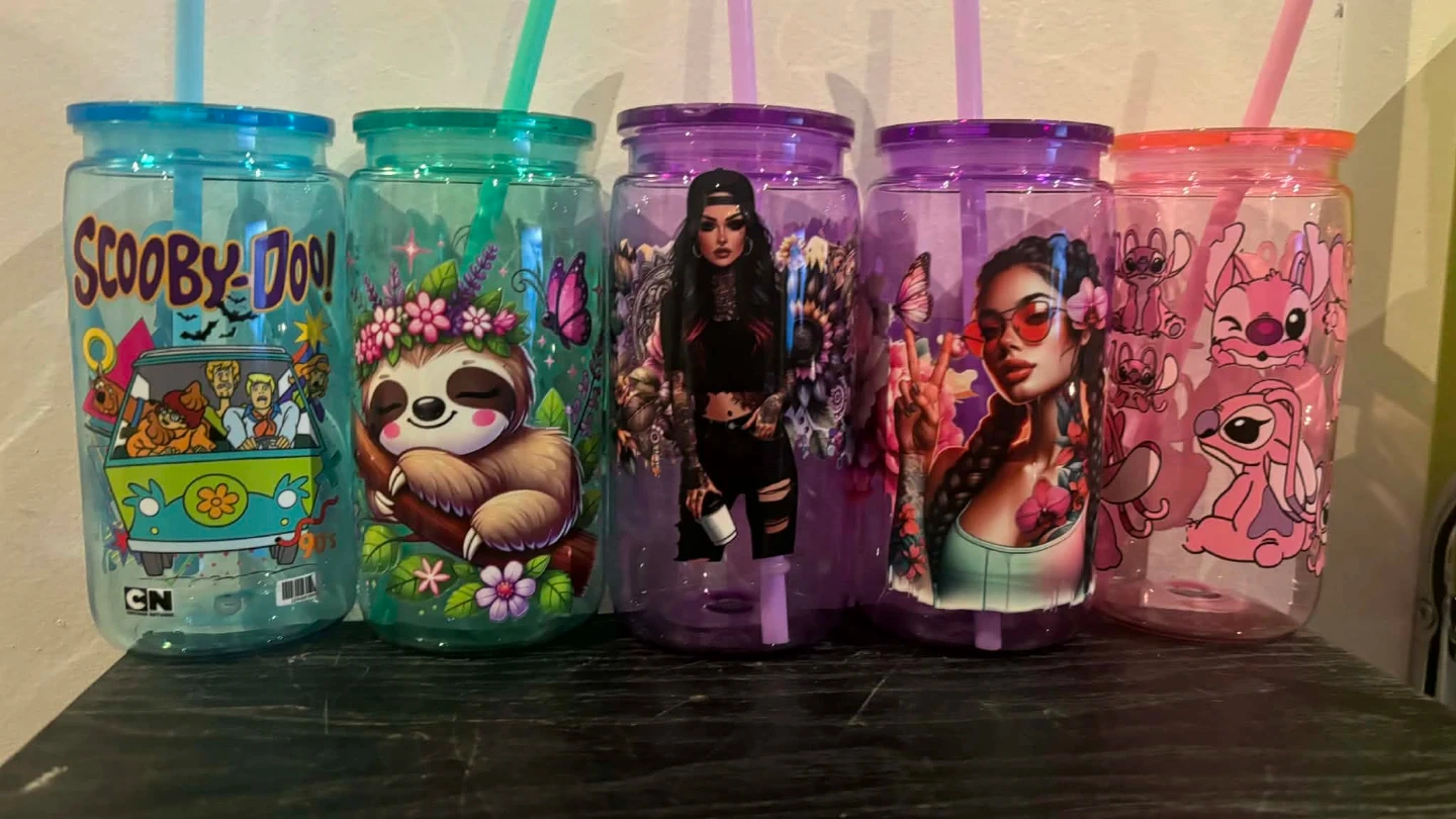 Set of reusable tumblers featuring various popular characters and designs. These plastic tumblers come with matching straws. They're great for cold drinks at home or on the go!