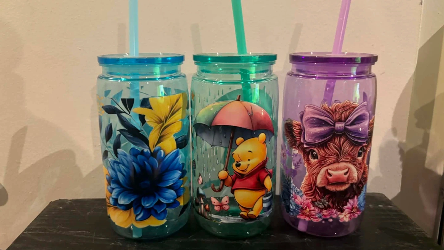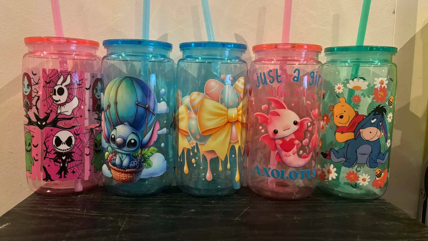 Set of reusable tumblers featuring various popular characters and designs. These plastic tumblers come with matching straws. They're great for cold drinks at home or on the go!