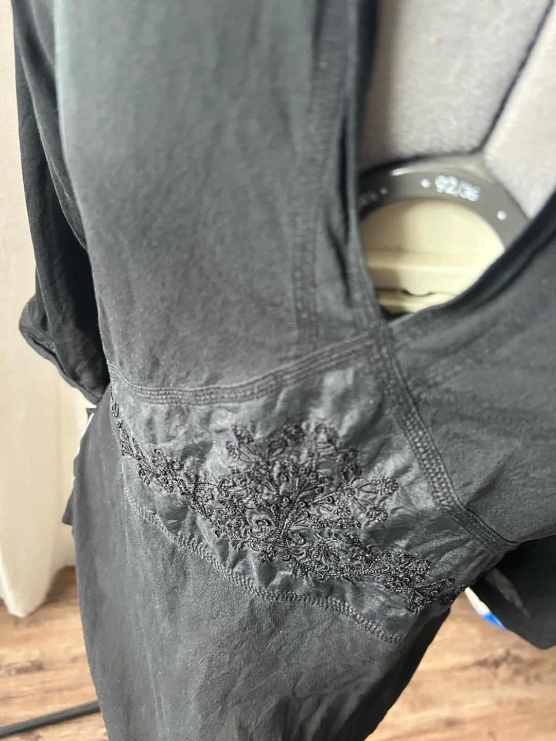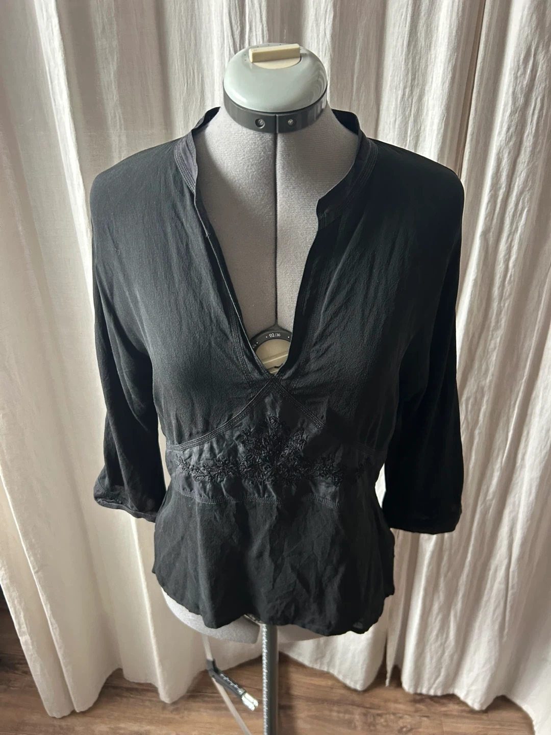 Black Nine West blouse. 100% silk material. Features delicate embroidery detailing at the waist. Size is medium. I am moving back to Australia and cannot take my whole collection, take a look at my other listings!