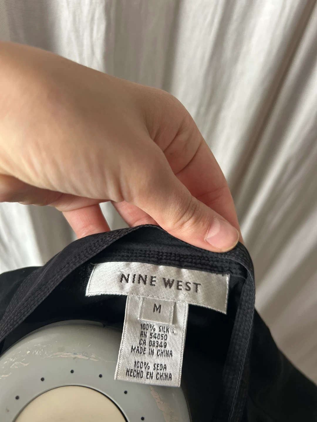 Black Nine West blouse. 100% silk material. Features delicate embroidery detailing at the waist. Size is medium. I am moving back to Australia and cannot take my whole collection, take a look at my other listings!