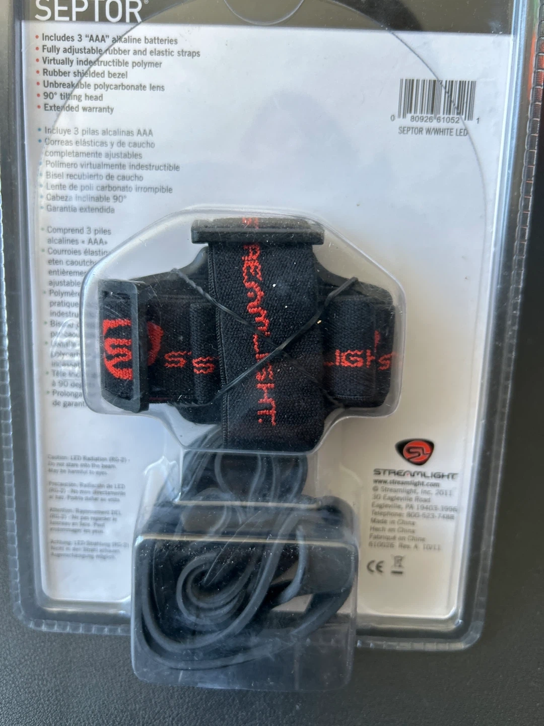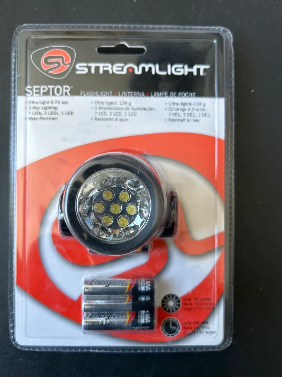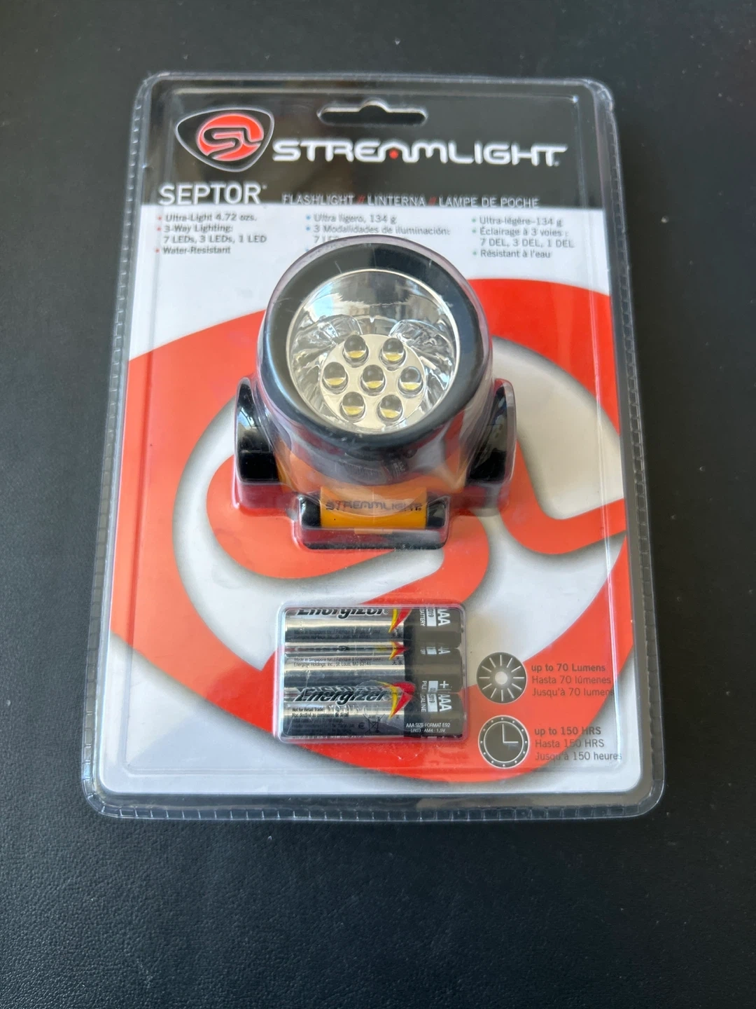 This Streamlight Septor headlamp is ultra-light and water-resistant. It features 7 LEDs and has 3-way lighting. It includes 3 AAA alkaline batteries and a fully adjustable strap.