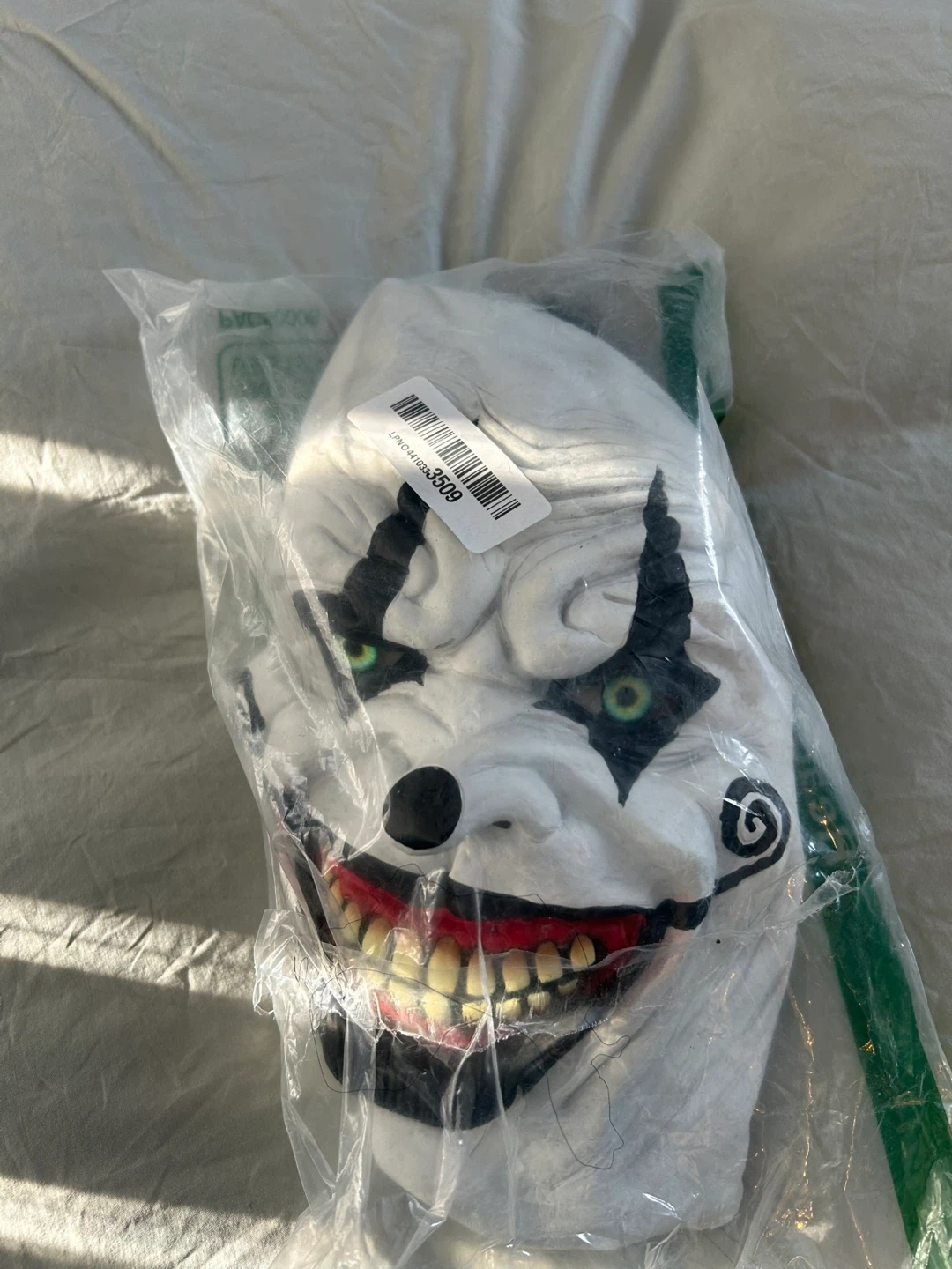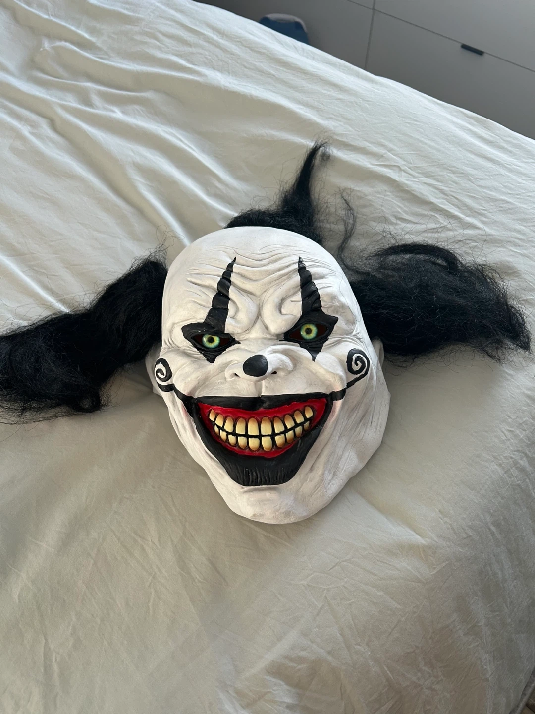 This mask features a classic scary clown design with green eyes and a wide, toothy grin. It's made of a white plastic material with attached black synthetic hair. Perfect for Halloween or costume parties!
