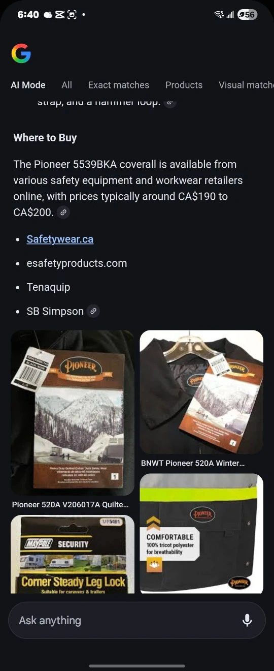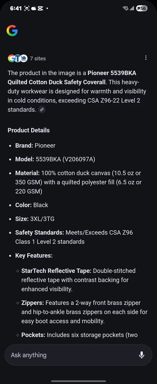 I have 2 Pioneer 5539BKA Quilted Cotton Duck Safety Coverall. It's a heavy-duty workwear designed for warmth and visibility in cold conditions, exceeding CSA Z96-22 Level 2 standards.