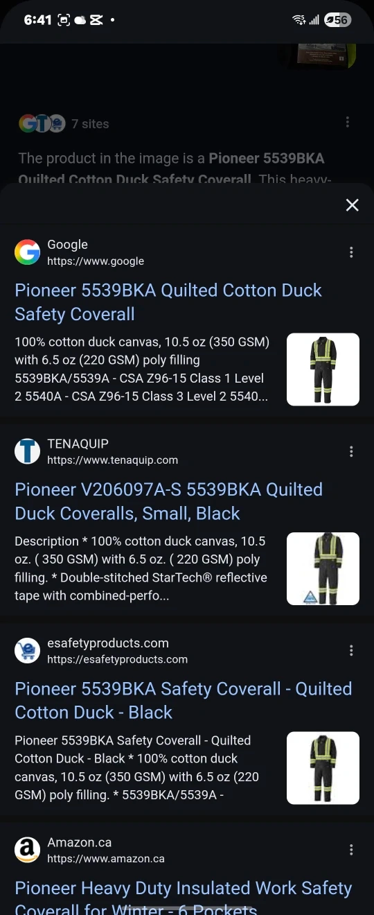 I have 2 Pioneer 5539BKA Quilted Cotton Duck Safety Coverall. It's a heavy-duty workwear designed for warmth and visibility in cold conditions, exceeding CSA Z96-22 Level 2 standards.
