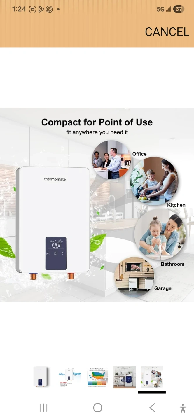 Thermomate POU 4500W tankless electric water heater. Size is 10.95" x 7.4" x 2.52". Temp range is 86°F-131°F. Power is 120V 25A. It provides on-demand hot water.