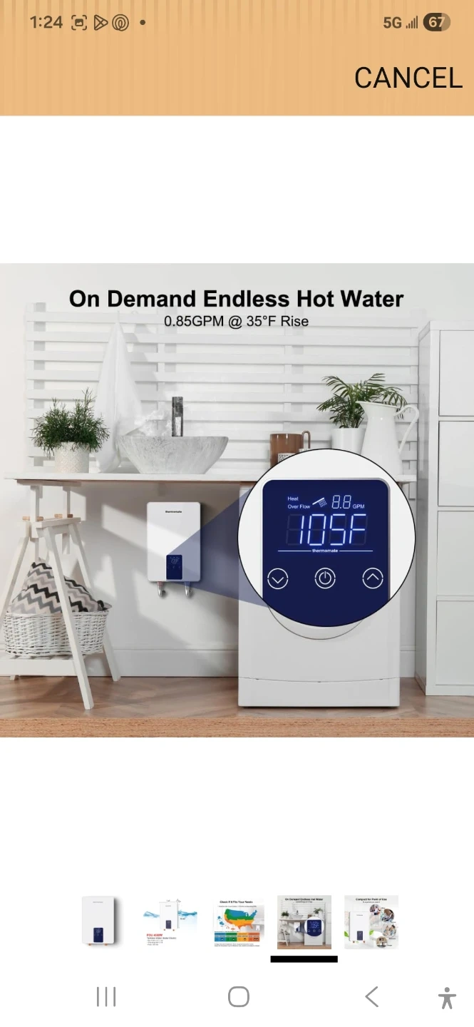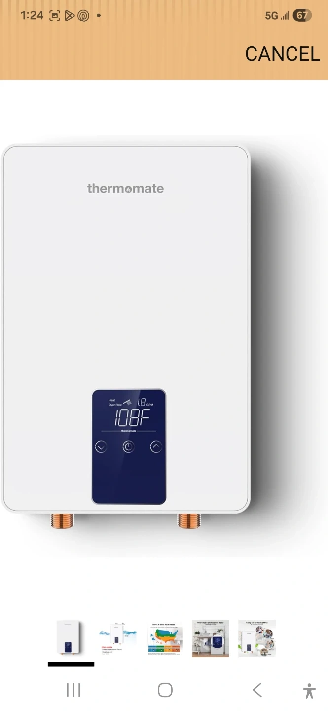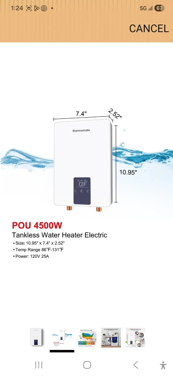 Thermomate POU 4500W tankless electric water heater. Size is 10.95" x 7.4" x 2.52". Temp range is 86°F-131°F. Power is 120V 25A. It provides on-demand hot water.