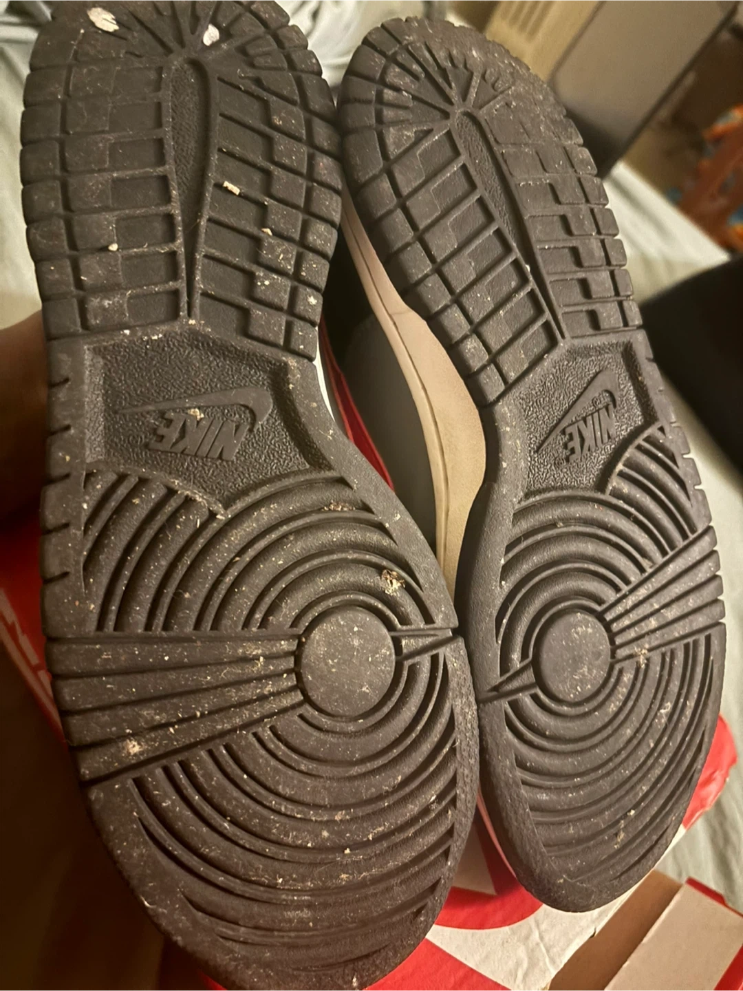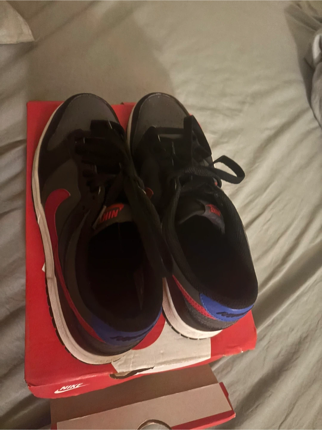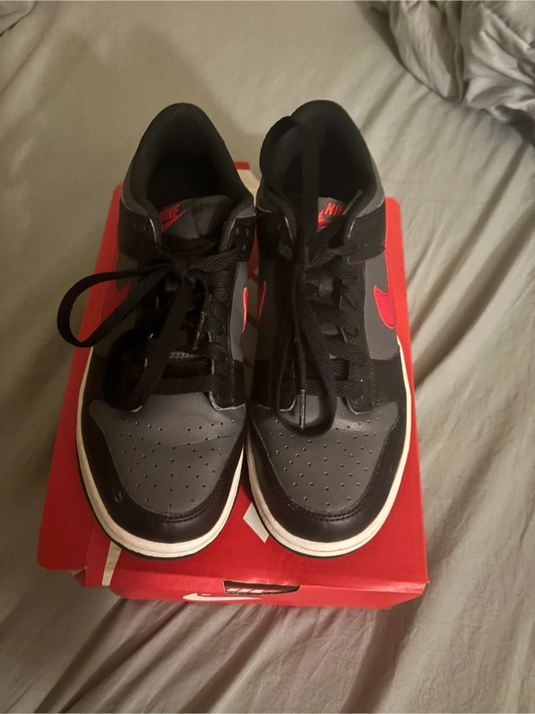 These are Nike Dunk Low sneakers in a black, grey, and red colorway. They feature a leather upper and rubber sole. Includes original box.