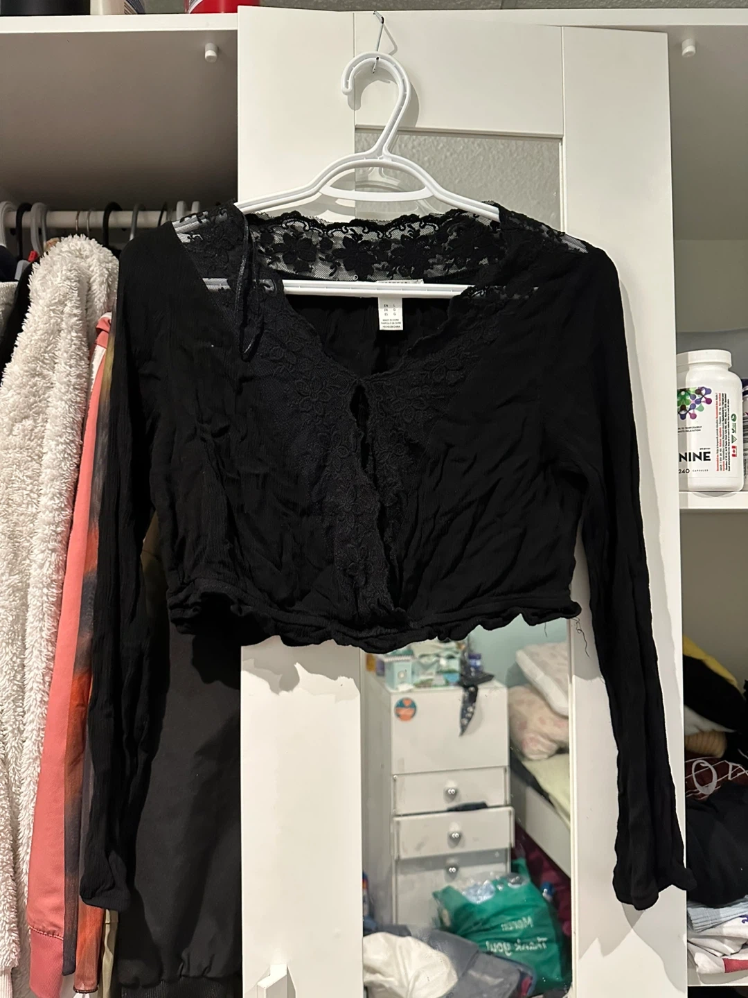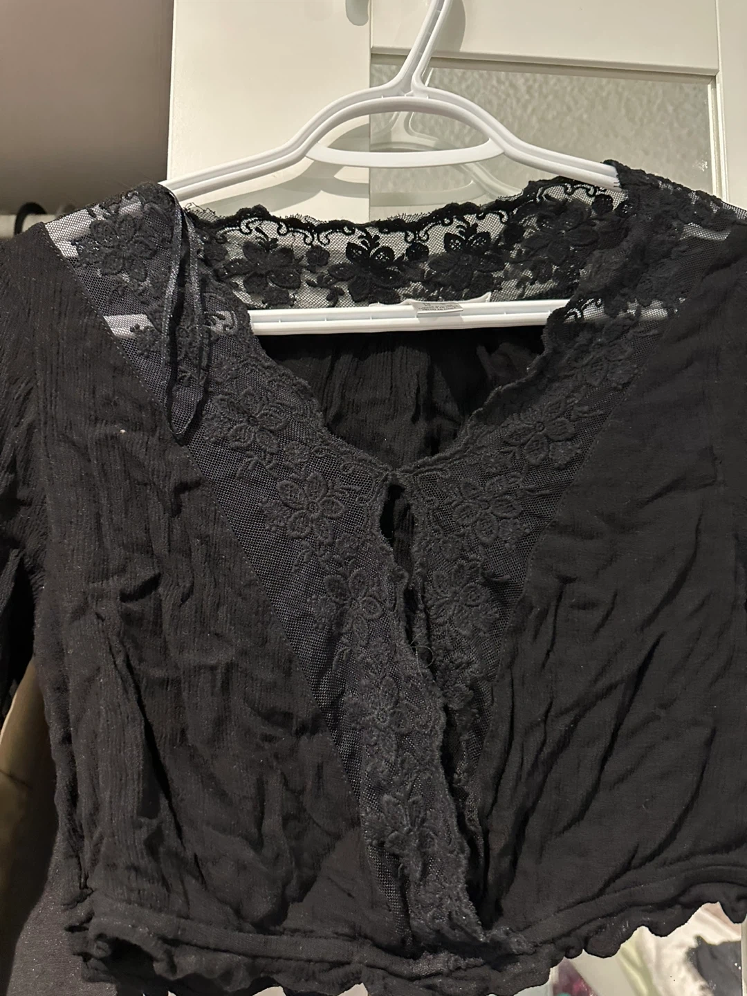 Selling a cute black long-sleeve top from Streetwear Society! It features a lace trim and is a size large. Perfect for layering or wearing on its own.