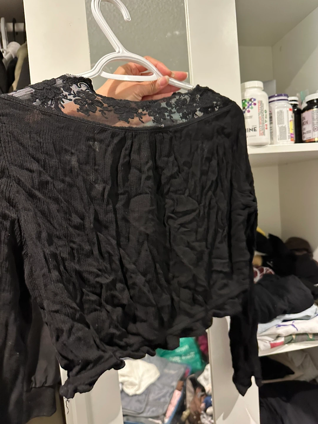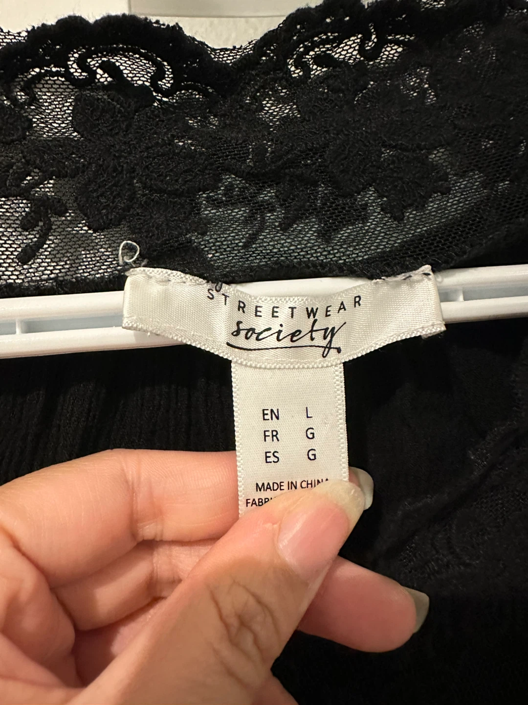 Selling a cute black long-sleeve top from Streetwear Society! It features a lace trim and is a size large. Perfect for layering or wearing on its own.