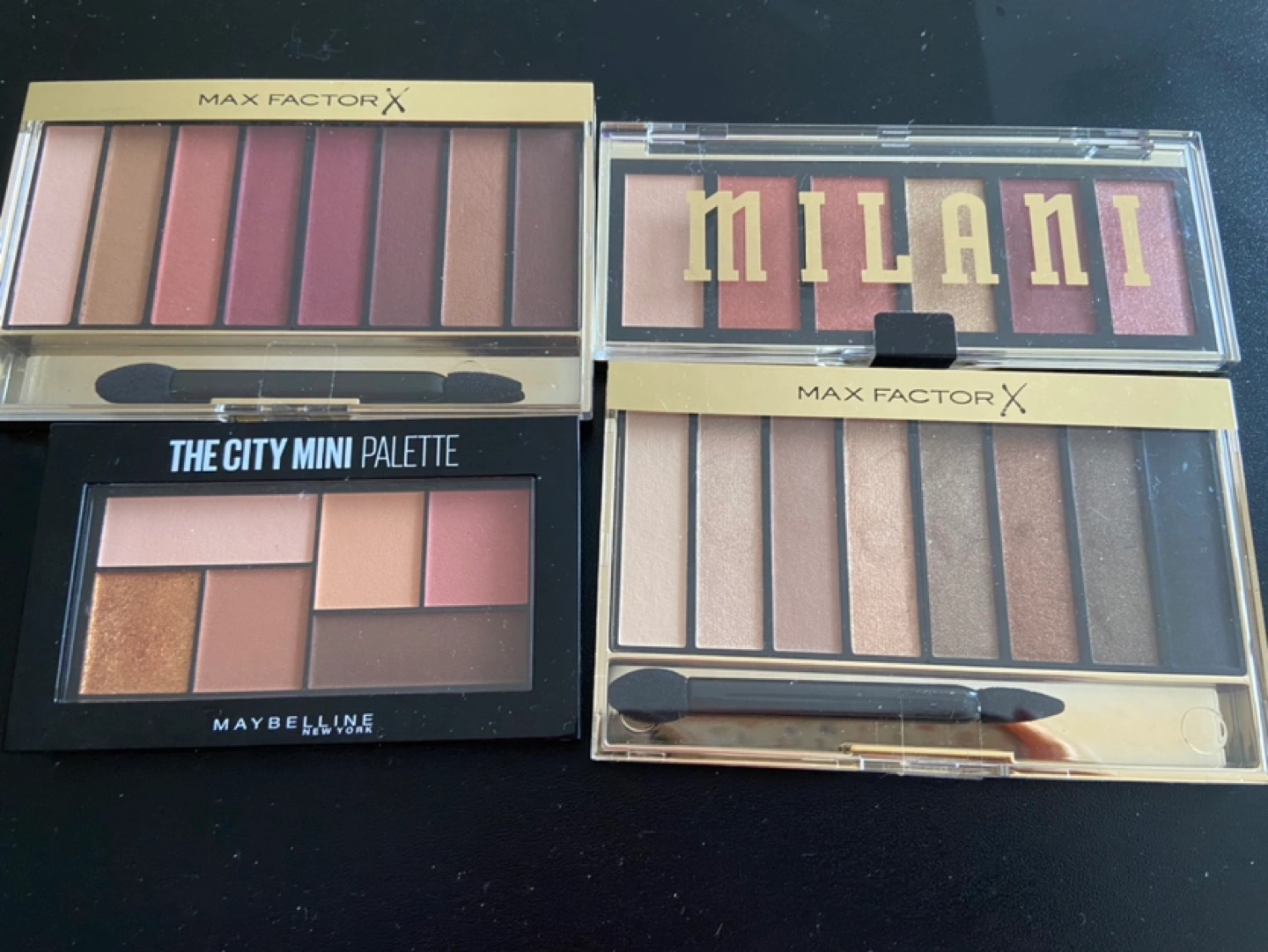 Three eyeshadow palettes. Includes Max Factor, Milani, and Maybelline brands. Various colours and shades. Mini and standard sizes.