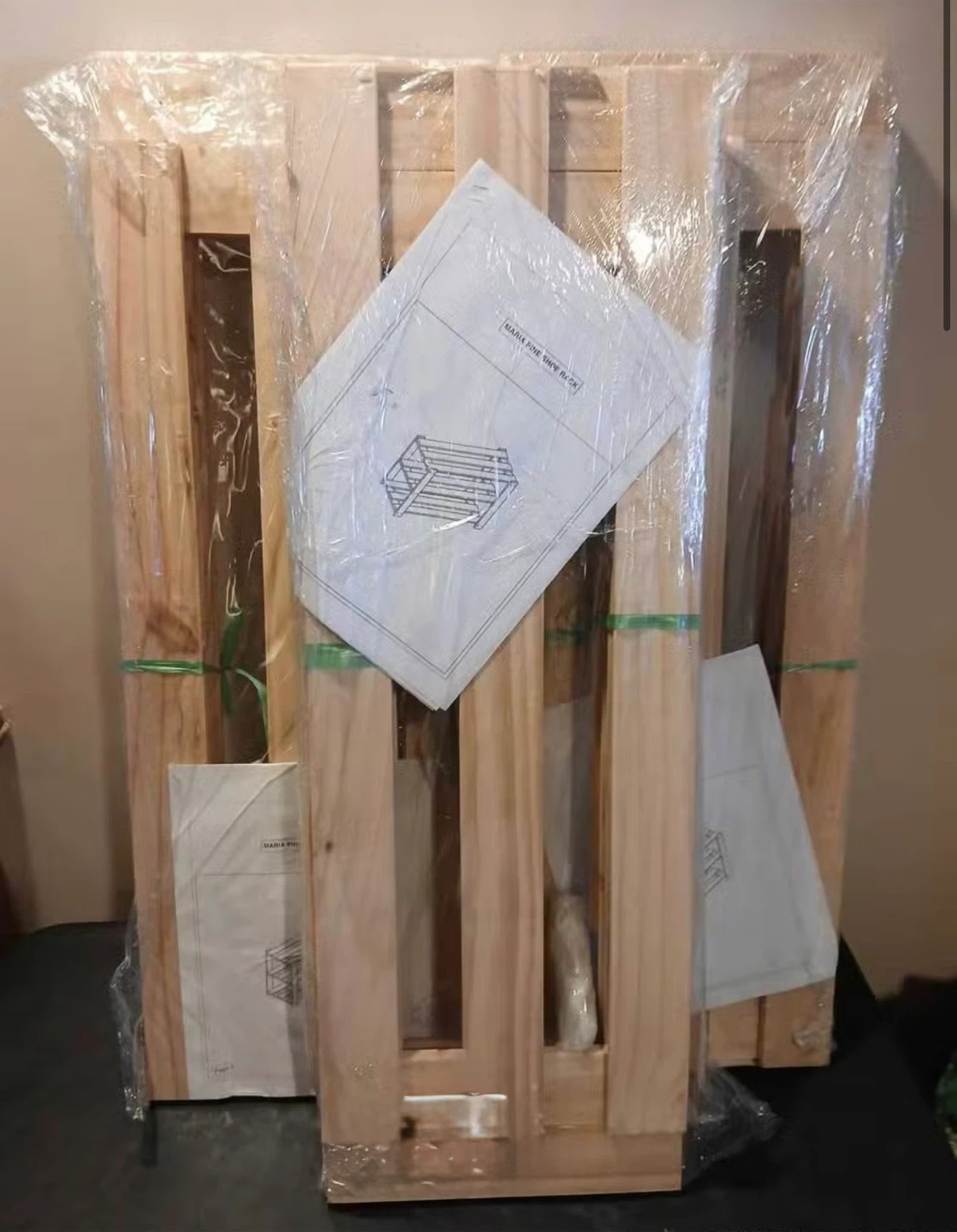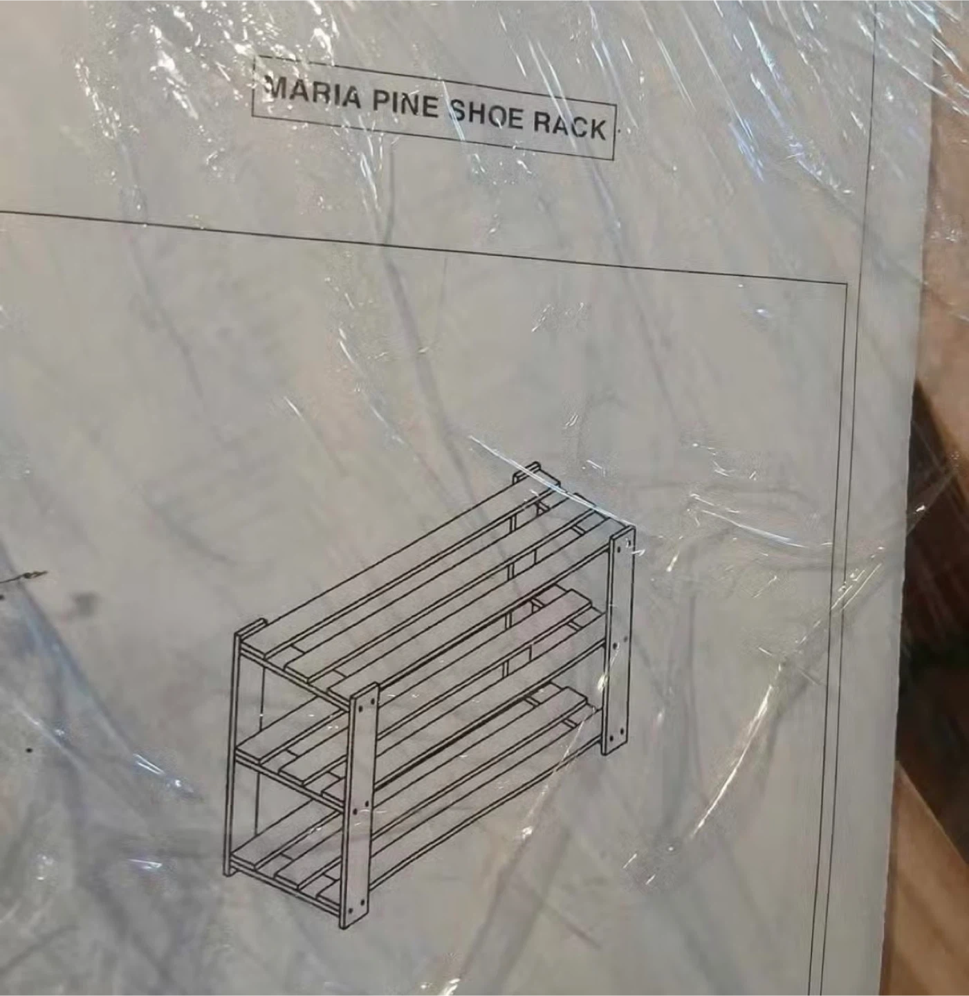 This is a new Maria Pine shoe rack. It's made of pine wood and features three shelves for storage. It's a practical solution for keeping your footwear tidy.