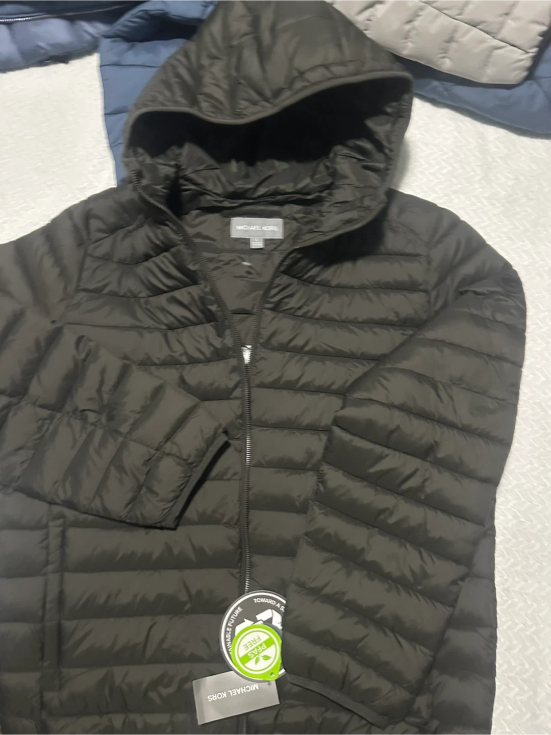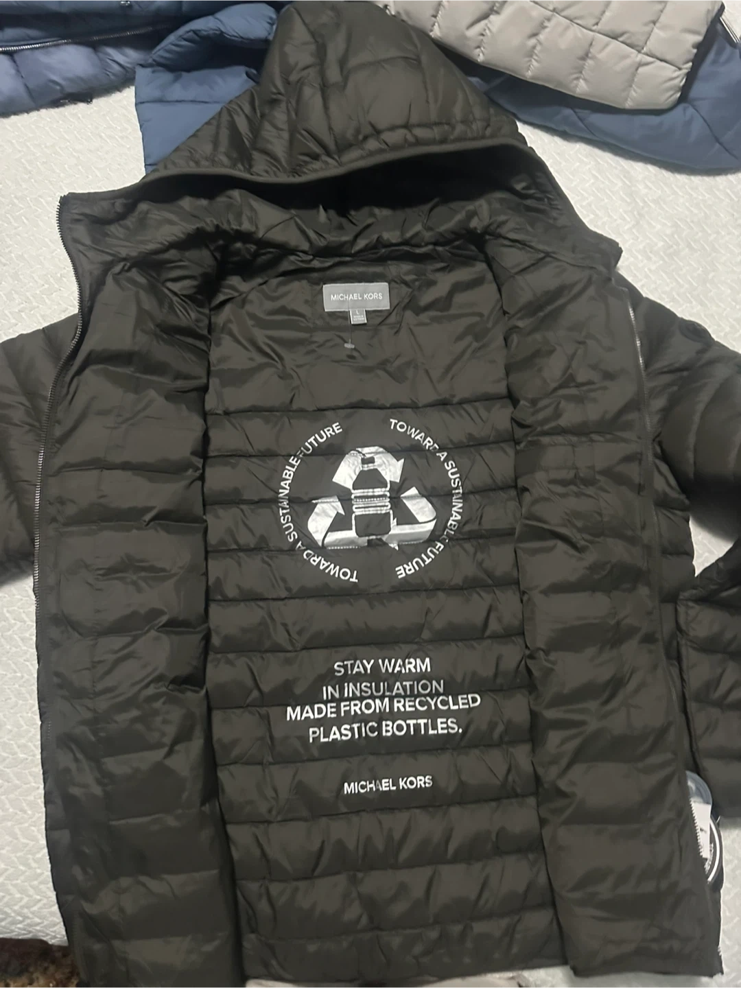 Selling a Michael Kors packable puffer jacket. It's a size L and features insulation made from recycled plastic bottles. Perfect for staying warm and sustainable!