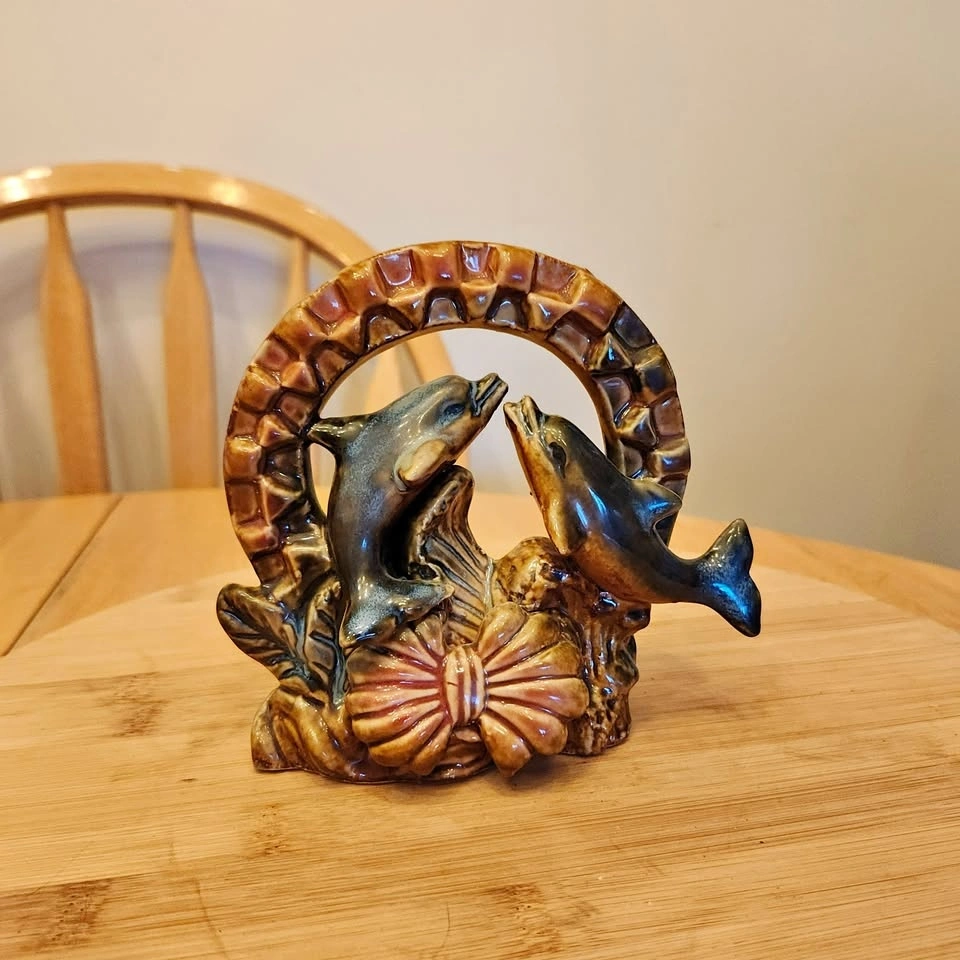 This glazed dolphin figurine will make a wonderful addition to your home decor. Perfect for a bathroom, living area, or possibly in a terrarium or aquarium. Approximate measurements: 6" Length (leaf to dolphin tail), 5.5" Height, 2.5" Width (bottom of base). No chips, cracks, or breaks. $5. Cash only. Pick up in Varsity, NW.