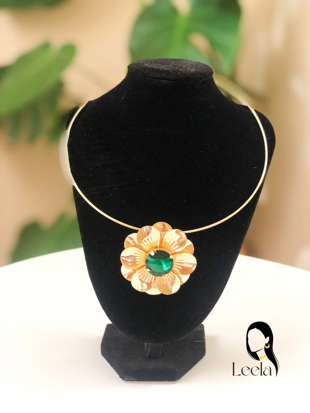 A beautiful gold-tone necklace, featuring a flower pendant with a green stone at the centre. This necklace is sure to add a touch of elegance to any outfit!