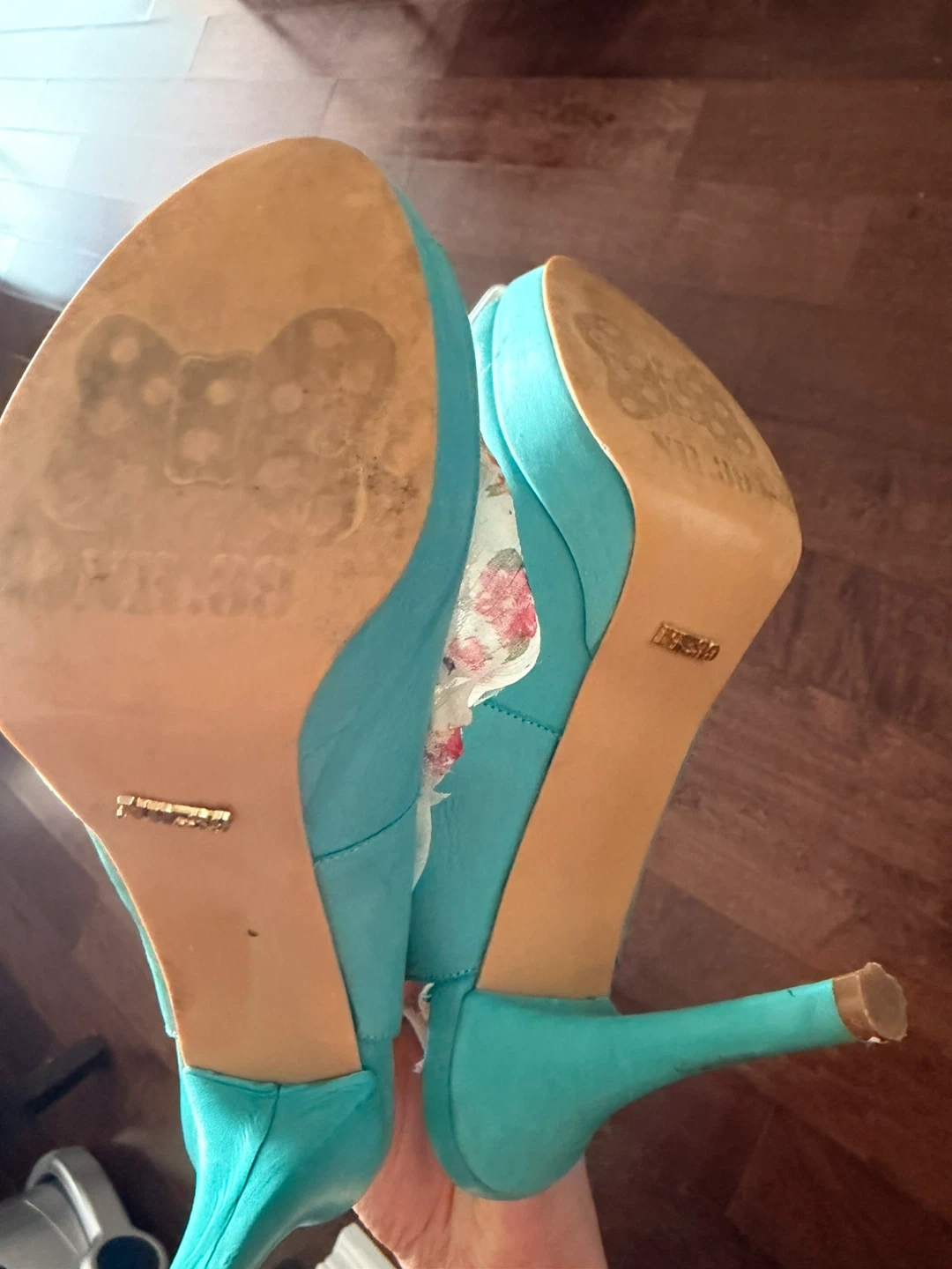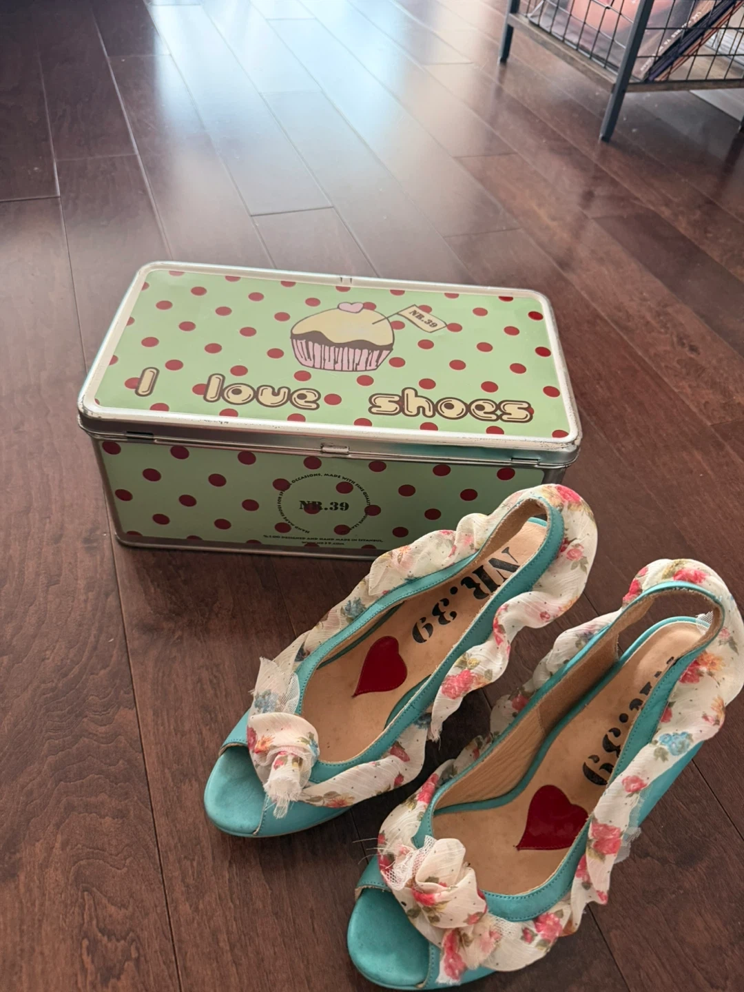 These stylish leather peep-toe heels come in a vibrant turquoise blue. They feature delicate floral ruffles around the open toe and heel strap. Includes a decorative "I love shoes" tin for storage.