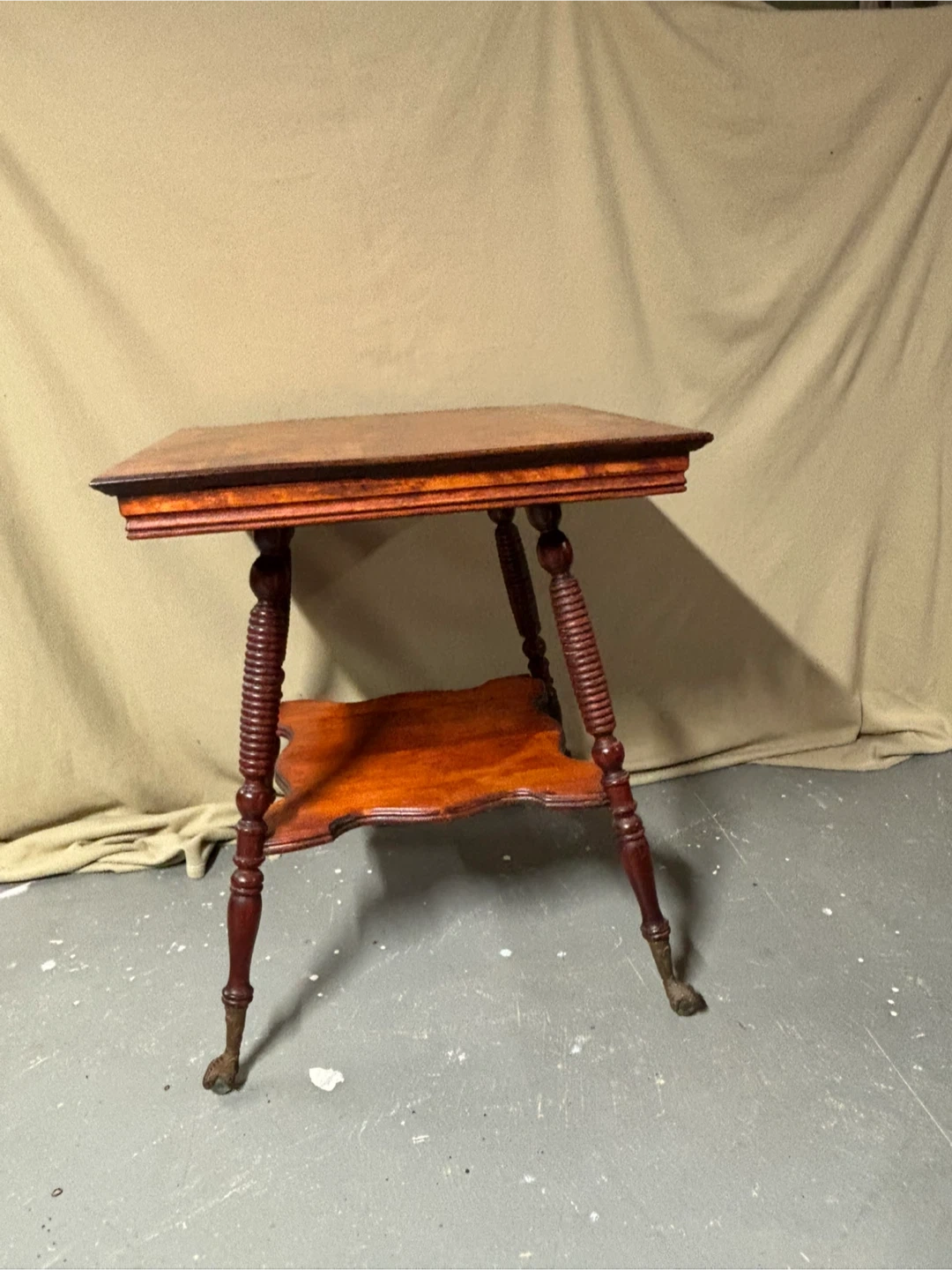 This is a beautiful antique accent table with two tiers. It has ornate carved legs that end in claw feet. The wood has a warm, rich finish.