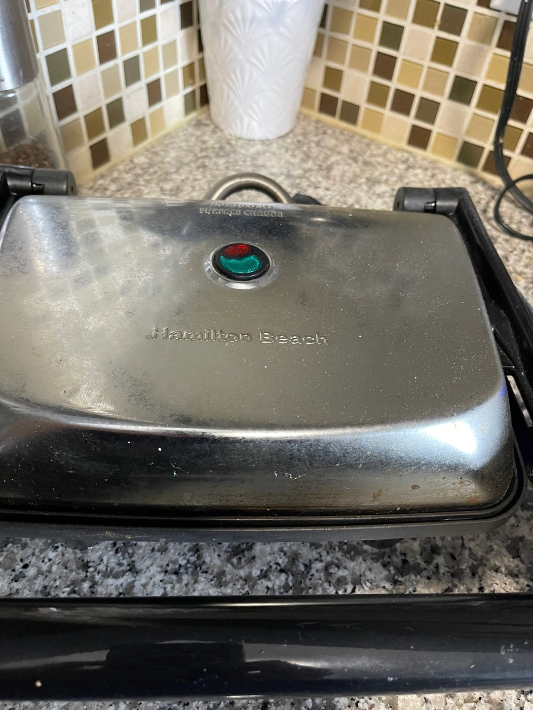 3 counter top appliances coffee machine air fryer and a grill Hamilton beach