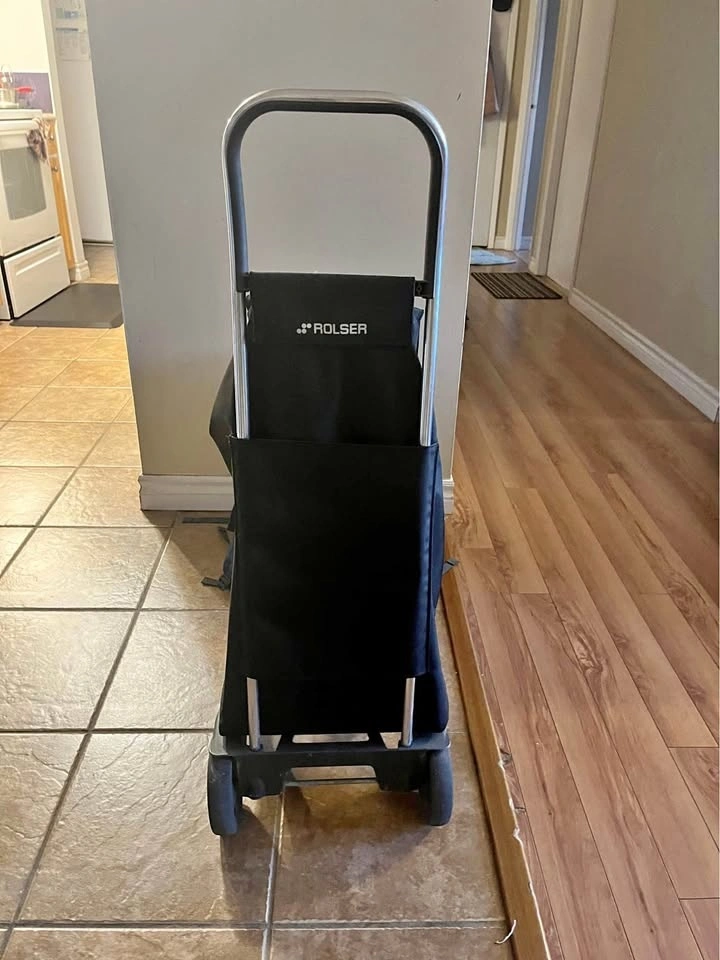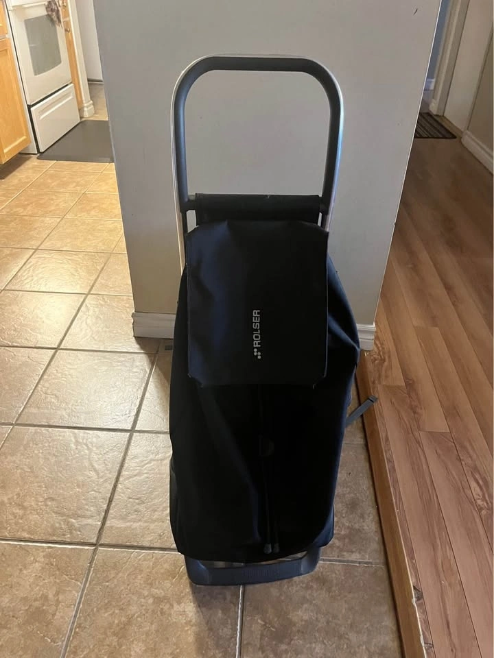 Rolser lightweight foldable shopping cart, perfect for groceries, laundry, or market trips. Features smooth rolling wheels, a sturdy aluminum frame, and a large fabric bag. Folds for easy storage. Very clean, barely used.