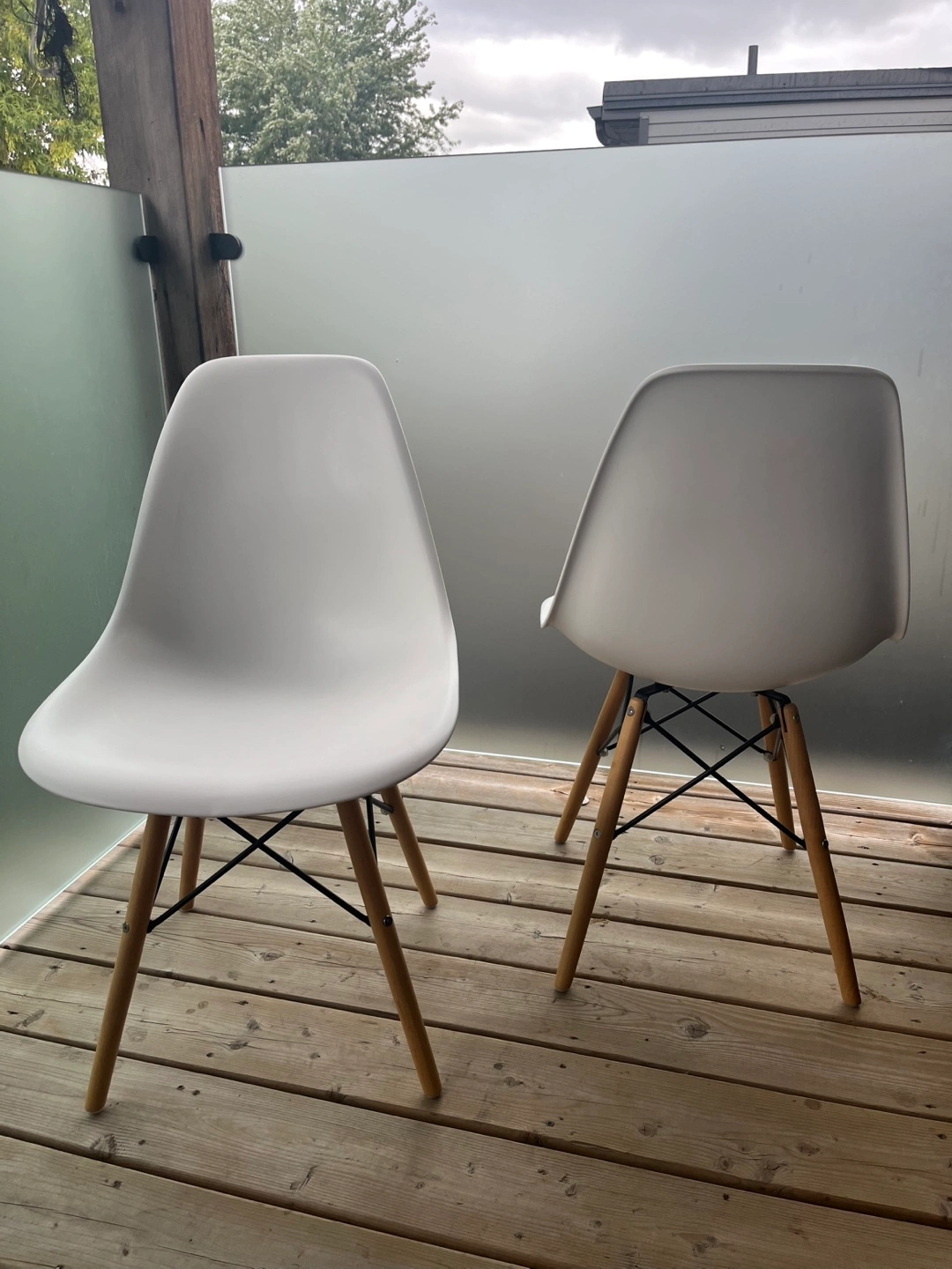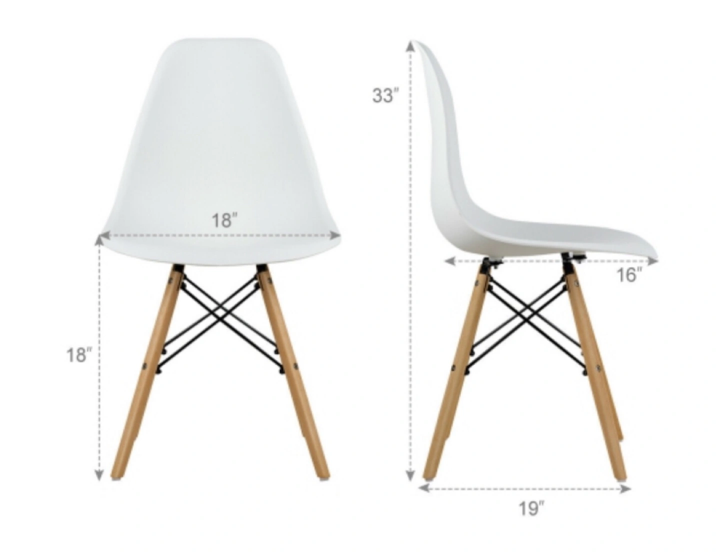 Selling 4 white Eames style dining chairs! It's in great condition and would look lovely in any dining room or kitchen. The chair features a white seat with wooden legs and black metal supports. It's 33 inches tall, 18 inches wide, and 19 inches deep, making it a comfortable and stylish addition to your home
