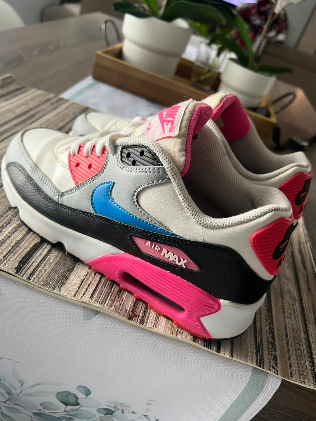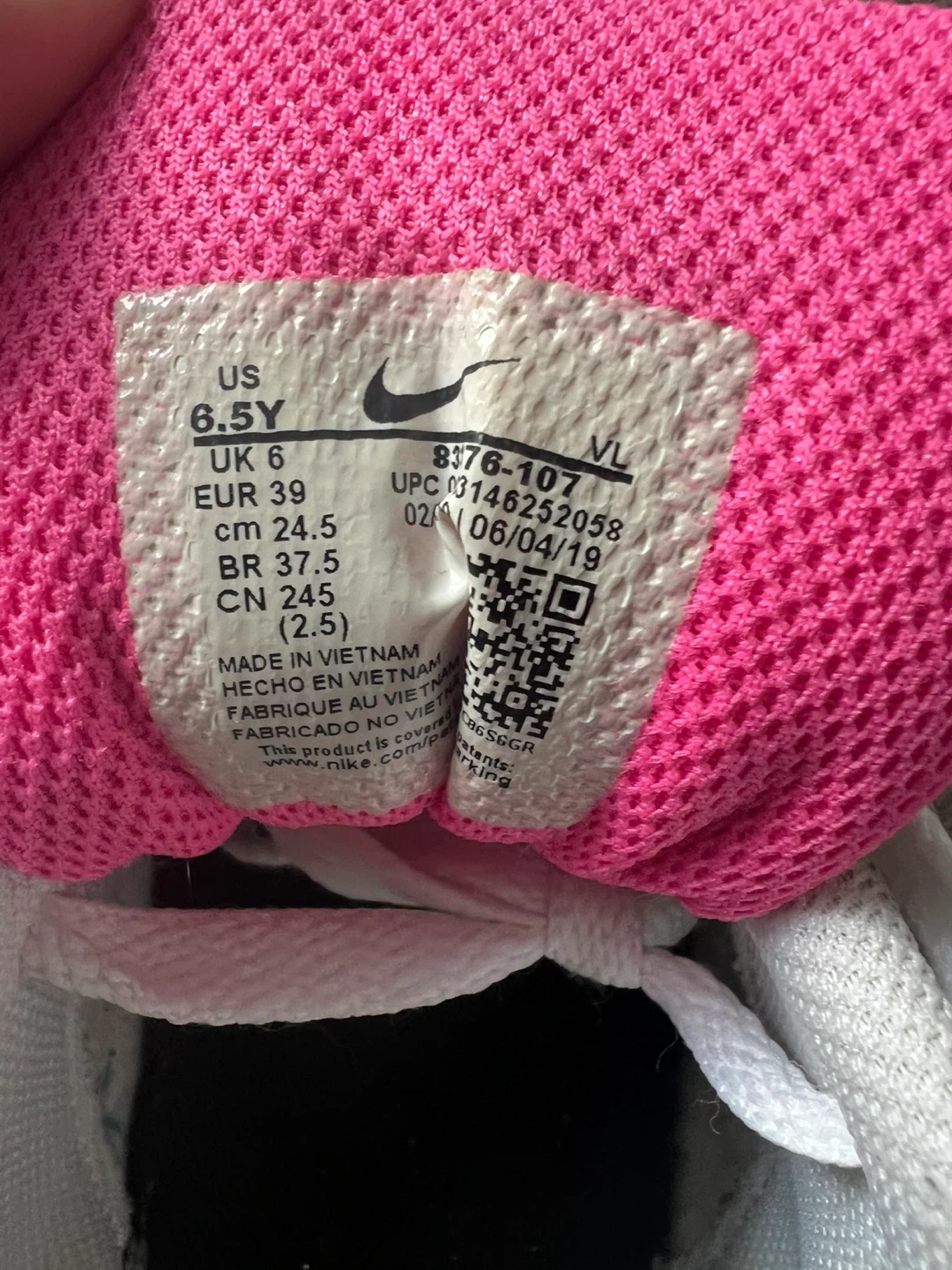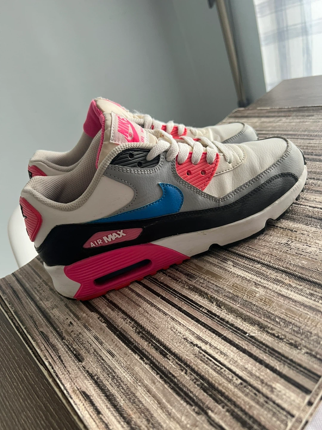 These Nike Air Max 90 sneakers are a youth size 6.5Y, featuring a white, pink, and blue colourway. They offer the classic Air Max cushioning. Great for active wear!