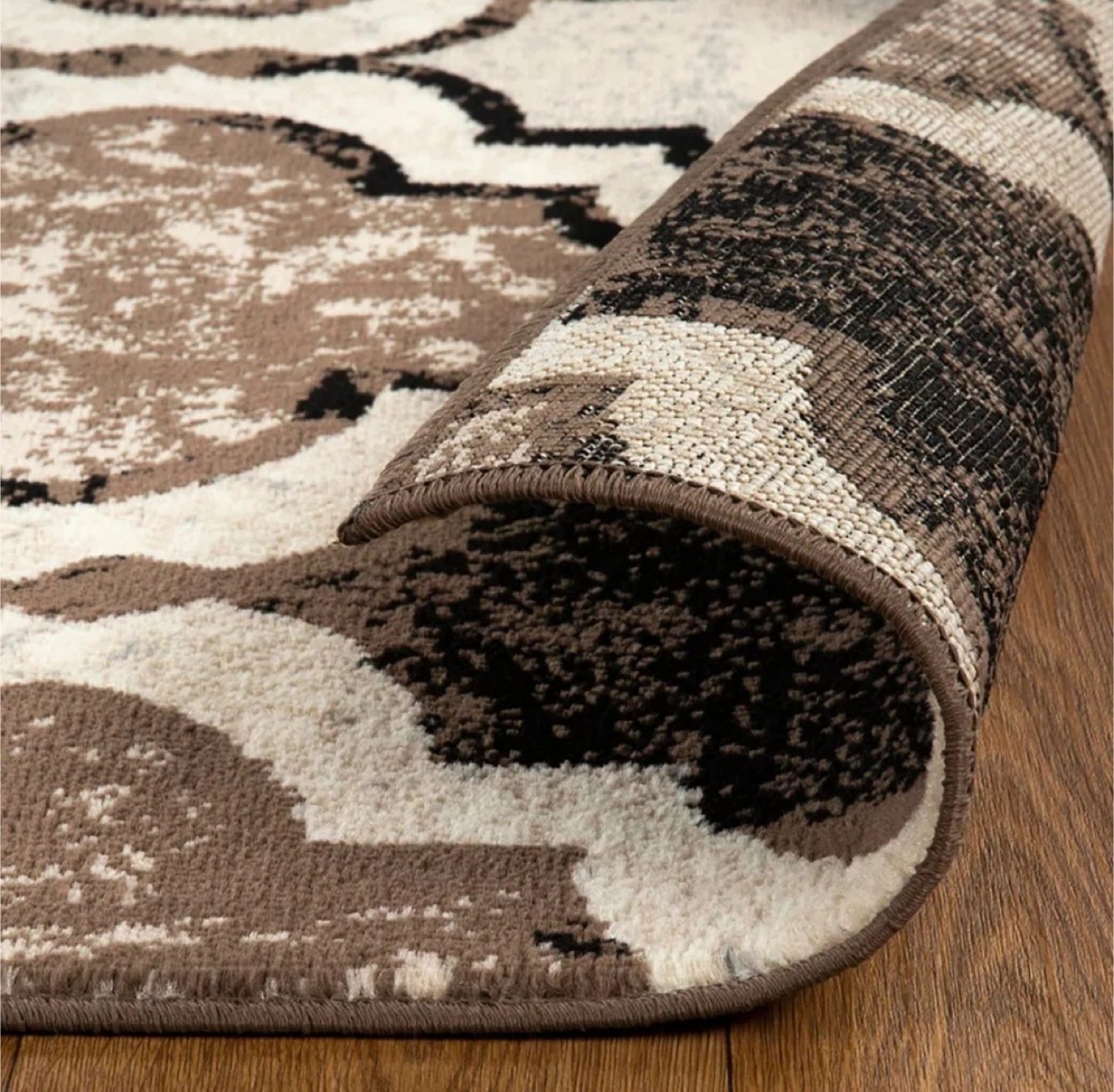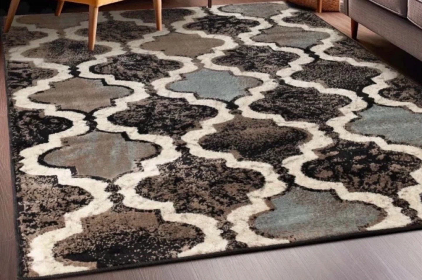 This large area rug features a Moroccan-inspired trellis pattern in brown, grey, and cream tones. With a contemporary geometric trellis design. The rug is made with durable materials and has a plush feel underfoot. It's a great way to add style and comfort to any room in your home! **Brand new still in original wrapping**