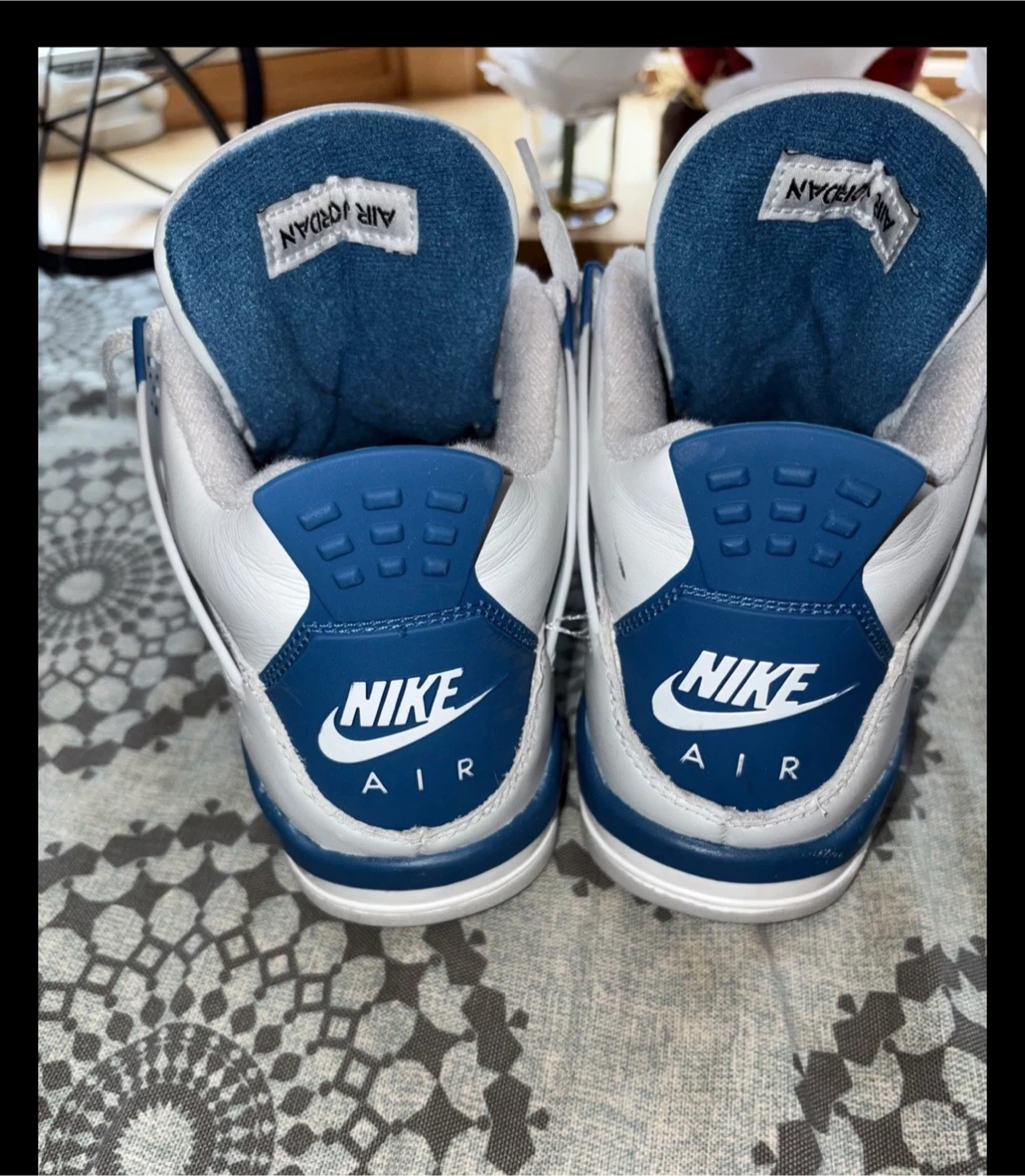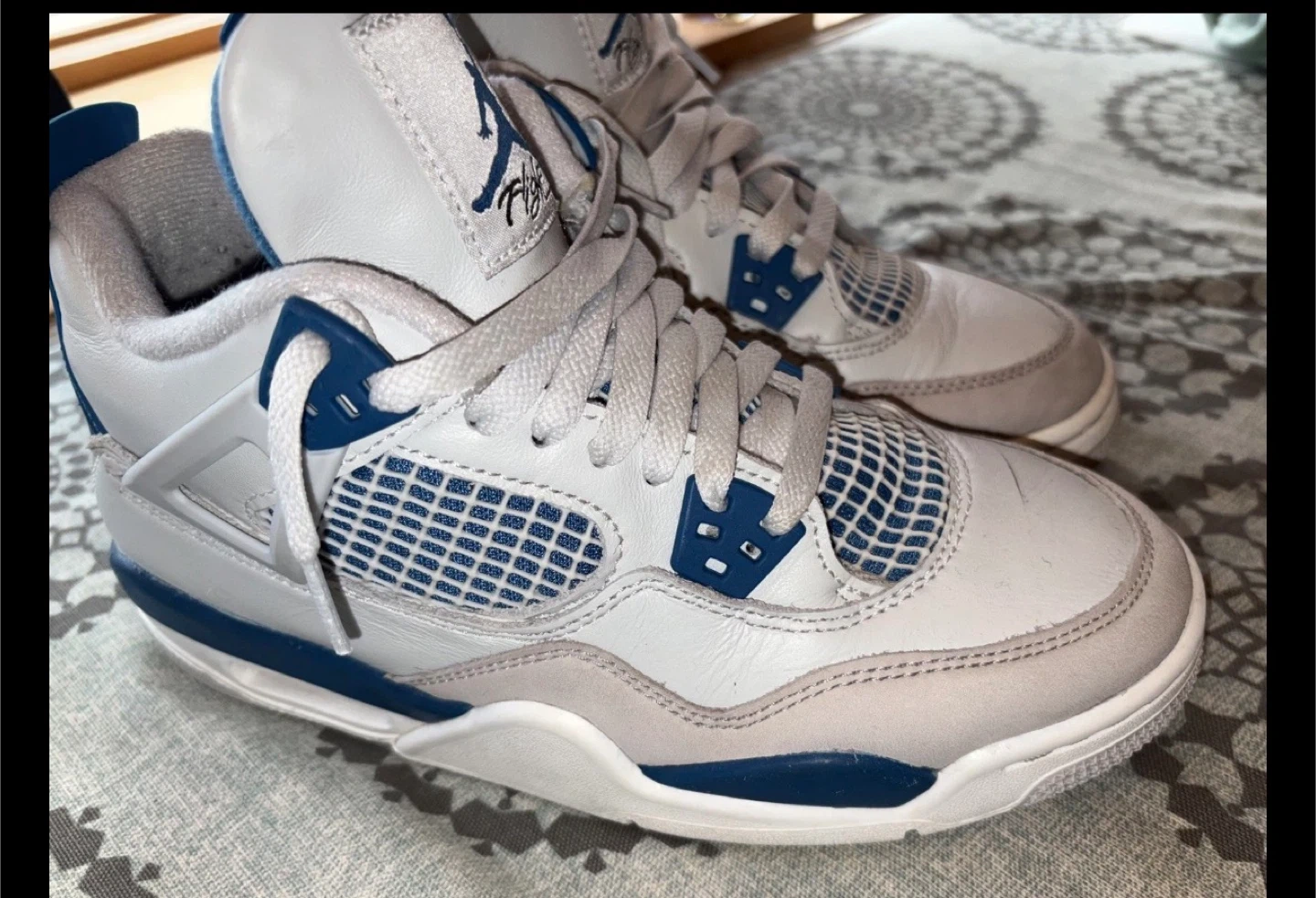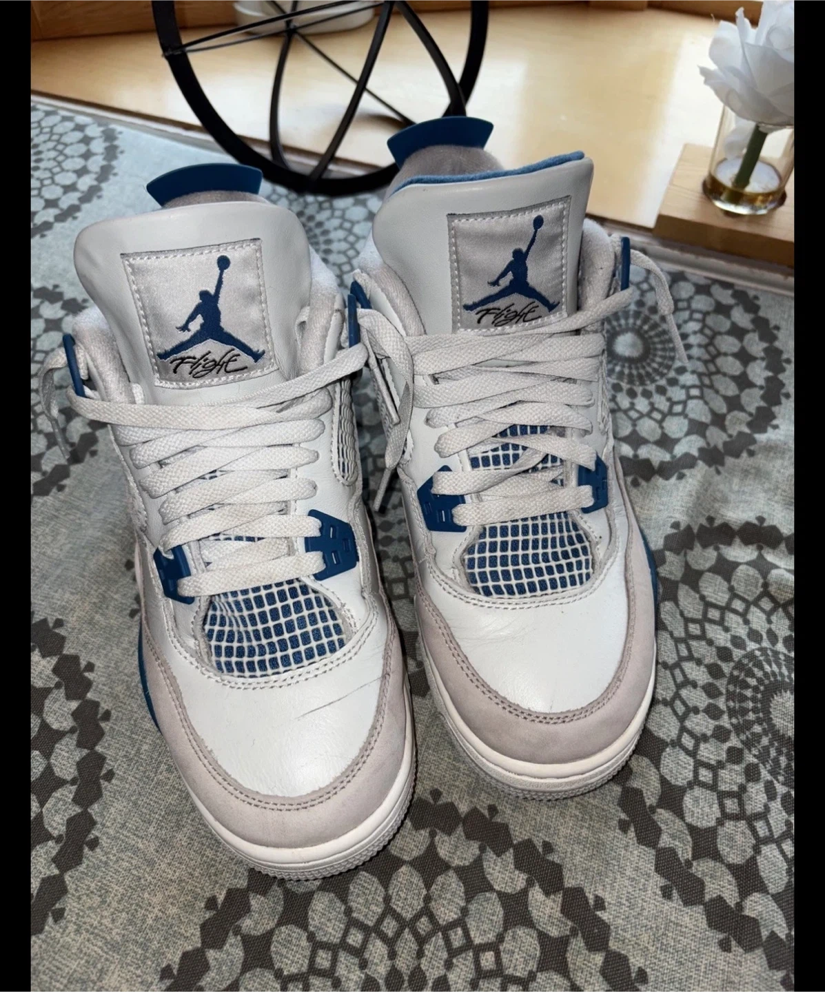 Classic Nike Air Jordan 4 sneakers in a white and blue colorway. Leather and mesh construction. These iconic shoes are a must-have for any sneaker collection!
