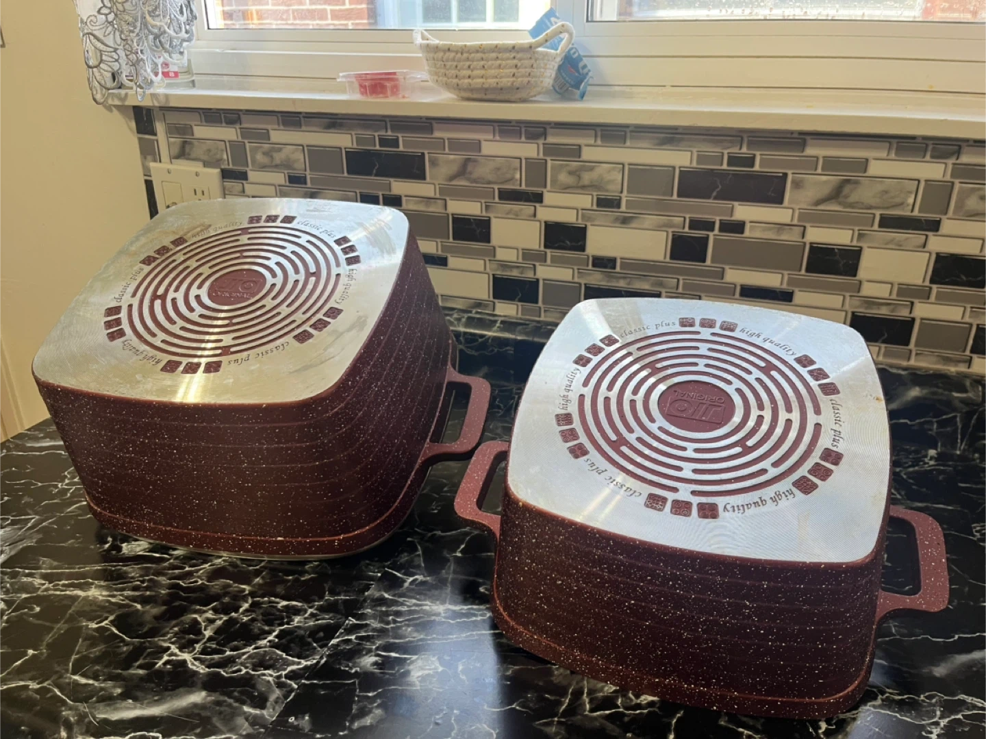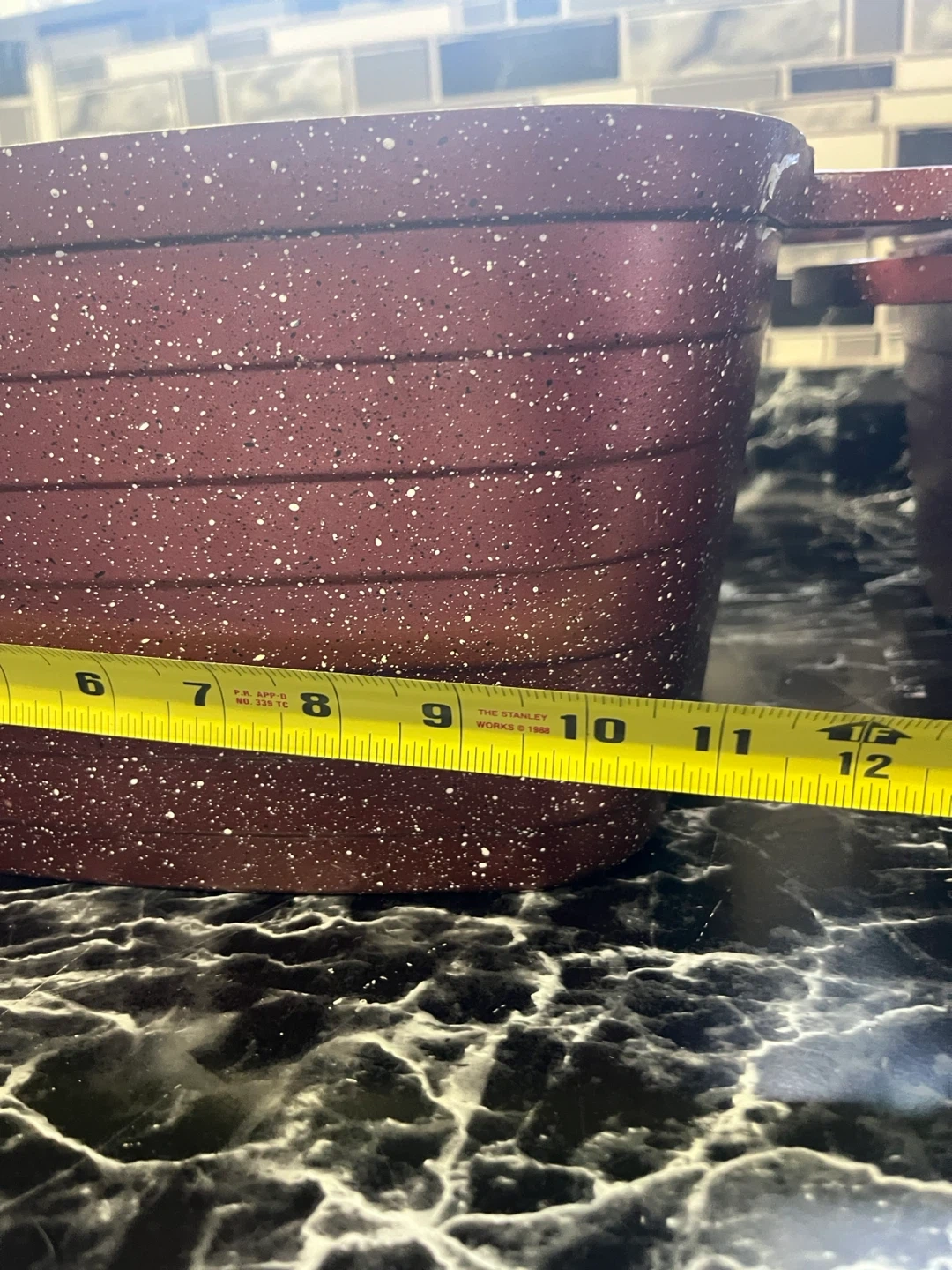 This set includes two square cookware pots with clear glass lids. The pots are a speckled deep red colour. Approximate dimensions for the larger pot are 11 inches wide and 6 inches deep. The smaller pot is approximately 9 inches wide and 5 inches deep. These pots are great for everyday cooking tasks!