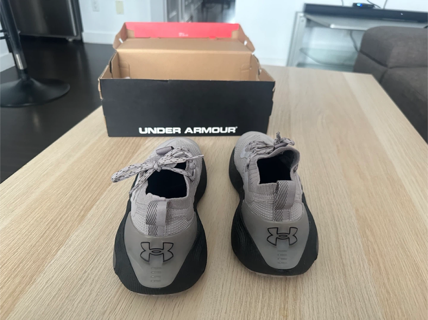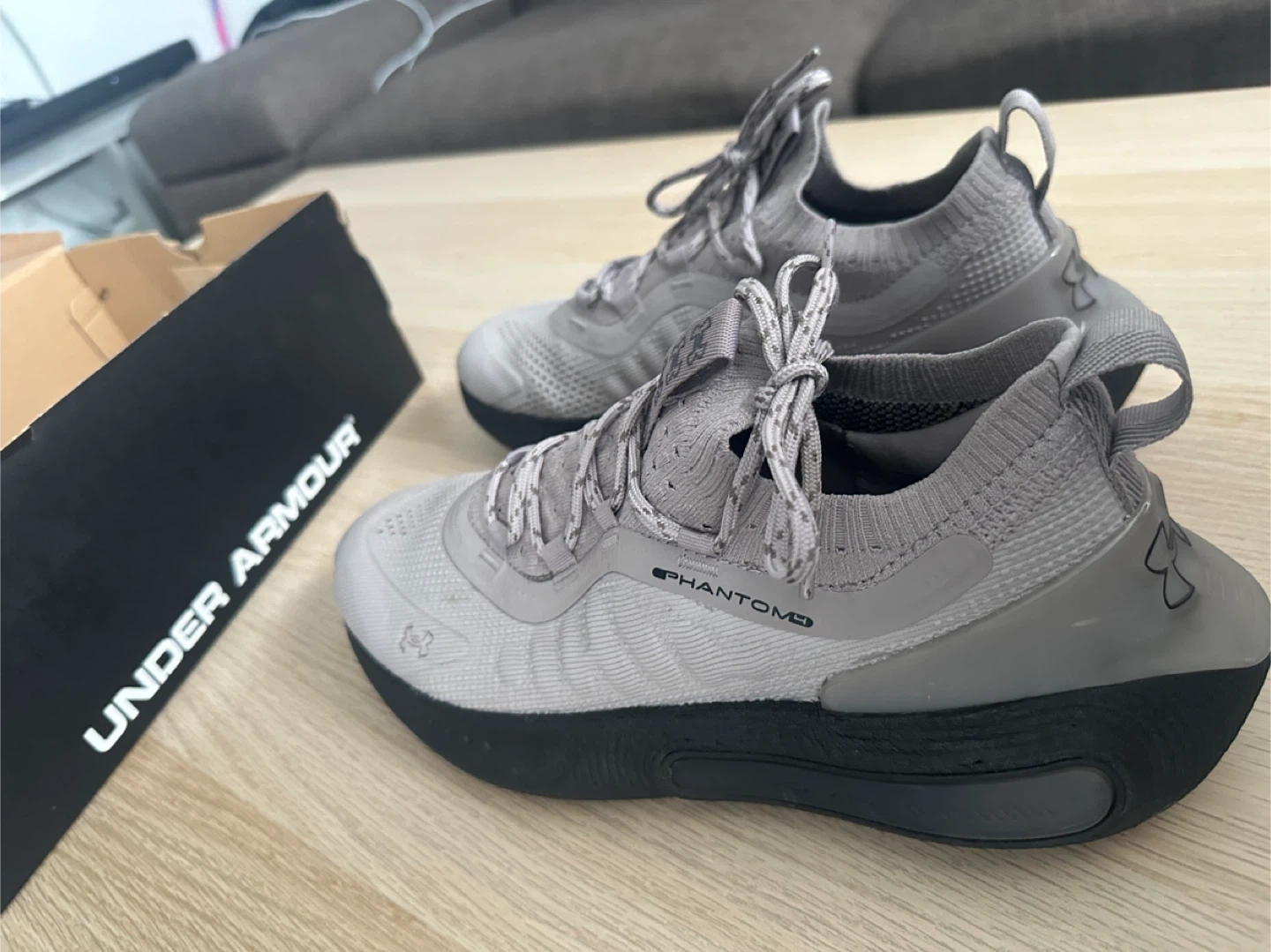 These Under Armour running shoes are grey with a black sole. They come with the original box. The Phantom model offers a comfortable fit for your runs!