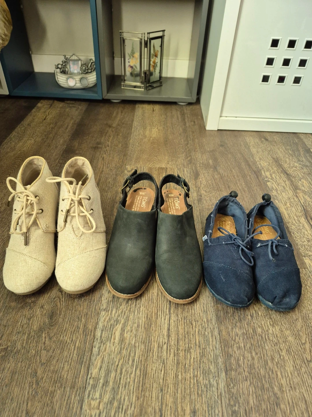 Cream coloured canvas wedge booties with lace-up front and cork heel Size 5.5, Toms Black Wedge Size 6 & Dark Blue Canvas Size 6.