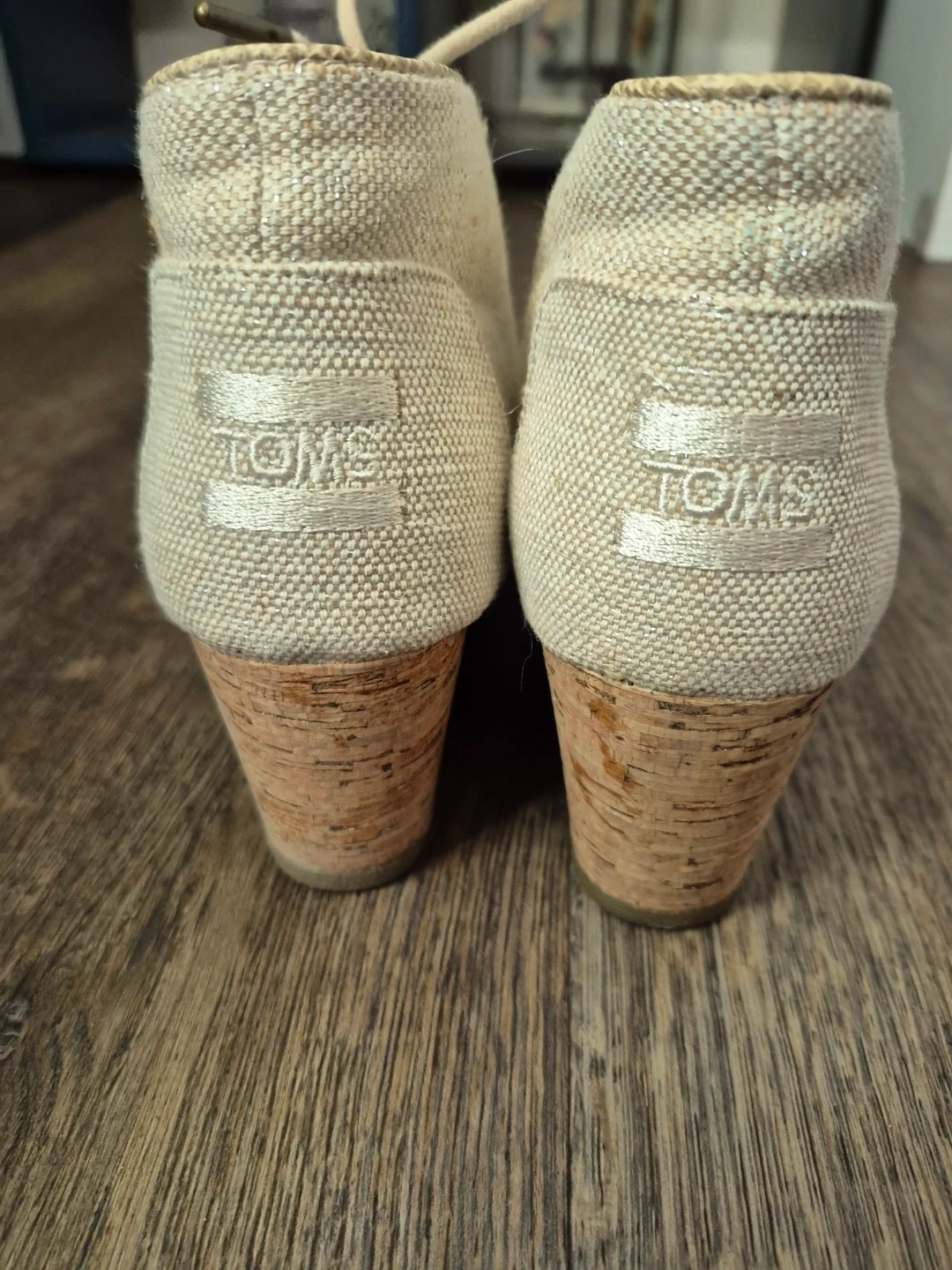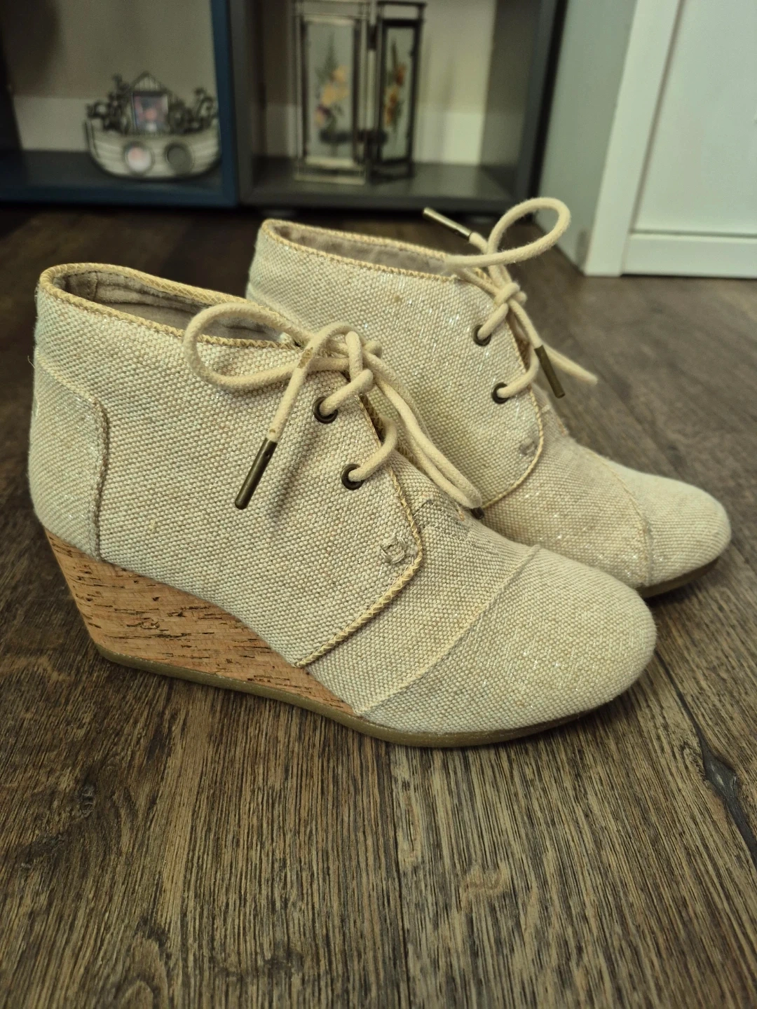 Cream coloured canvas wedge booties with lace-up front and cork heel Size 5.5, Toms Black Wedge Size 6 & Dark Blue Canvas Size 6.