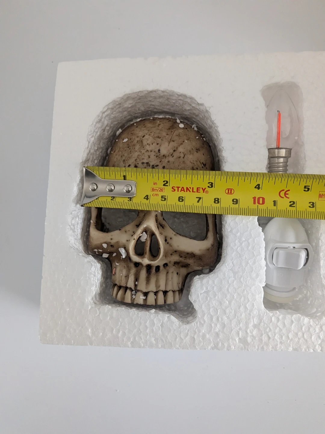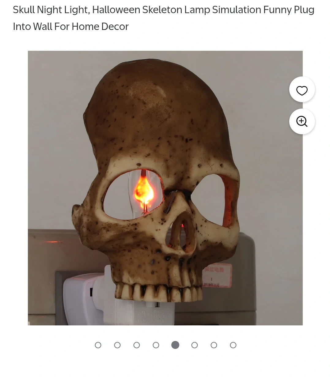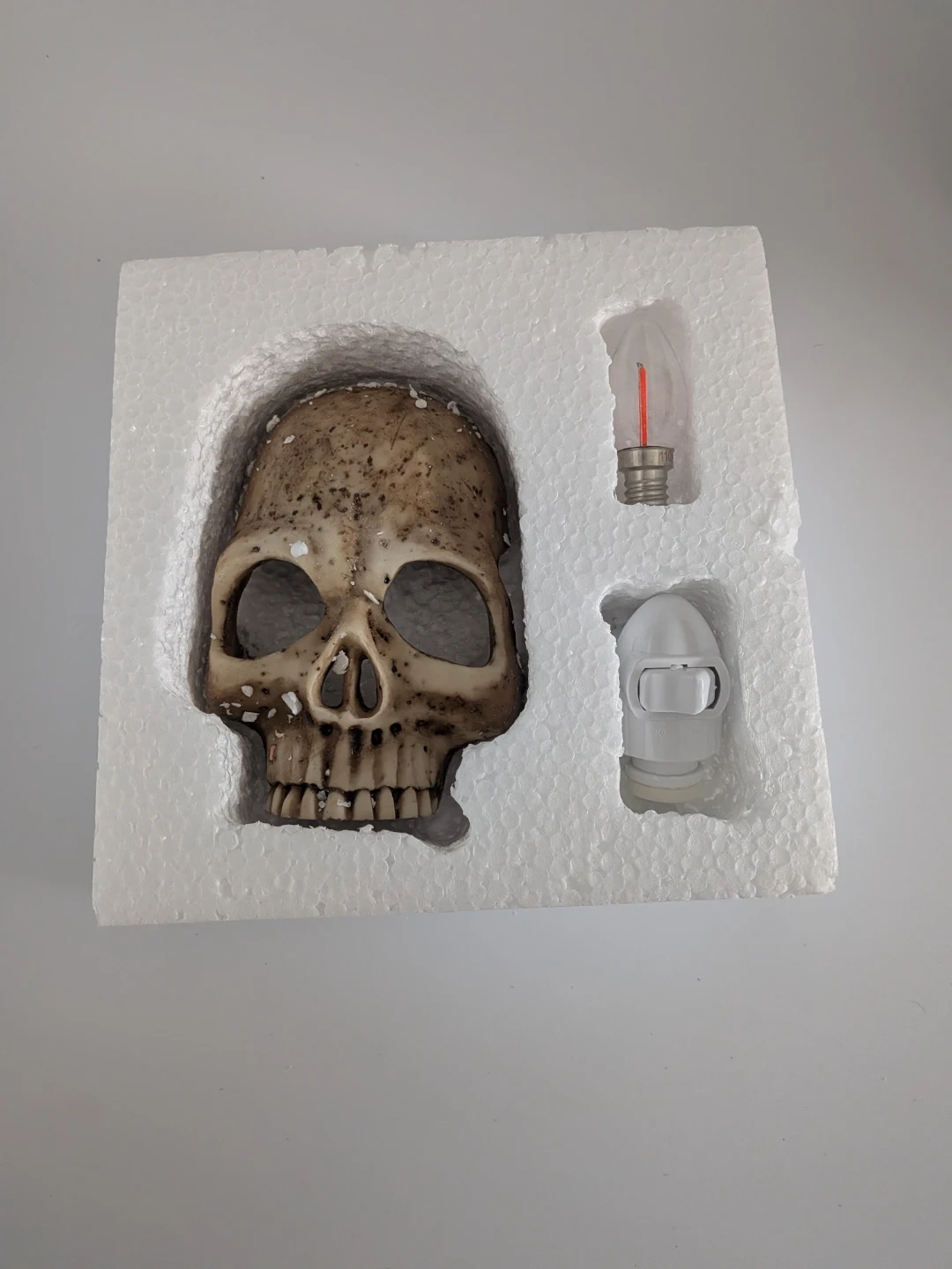 This new skull-shaped night light plugs into the wall. It includes a light bulb and a wall plug. The skull appears to be made of resin.