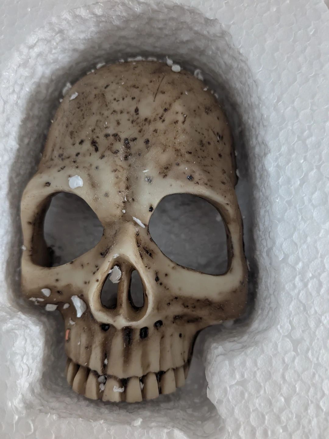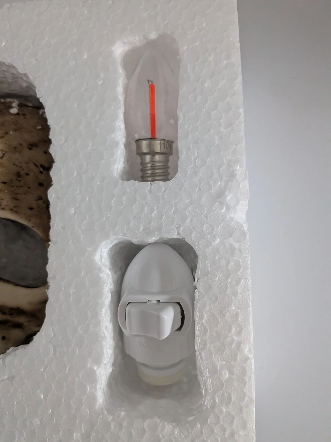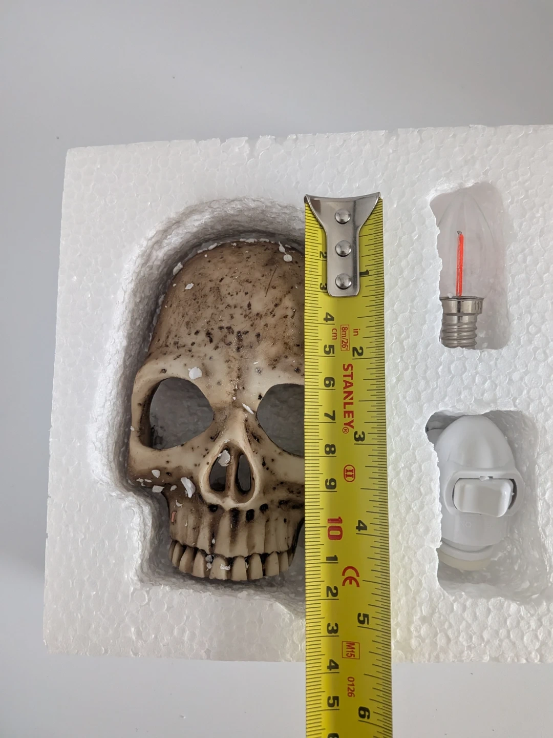 This new skull-shaped night light plugs into the wall. It includes a light bulb and a wall plug. The skull appears to be made of resin.