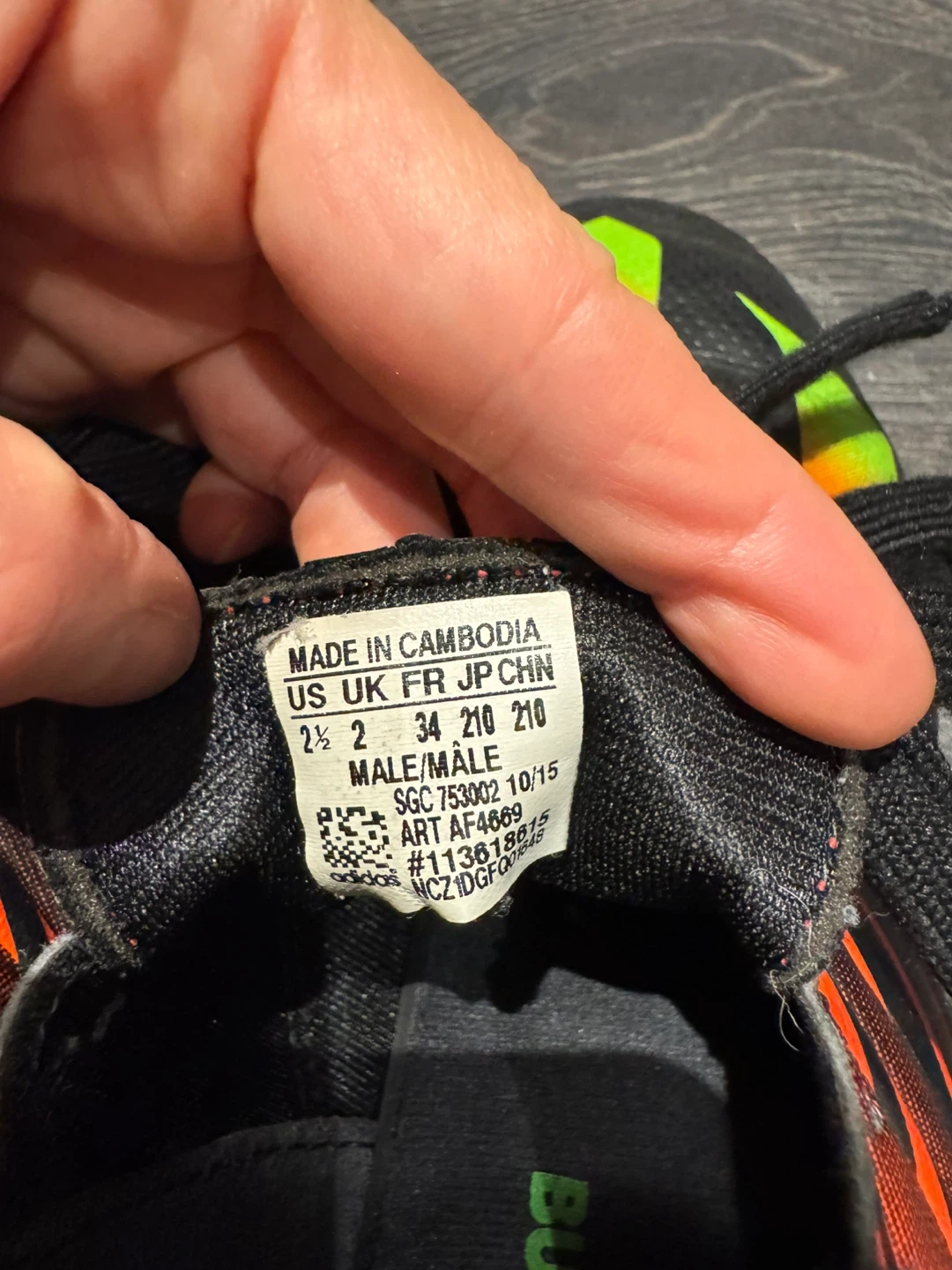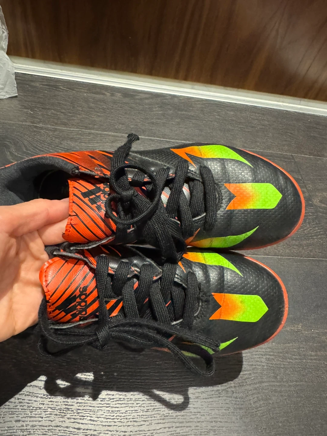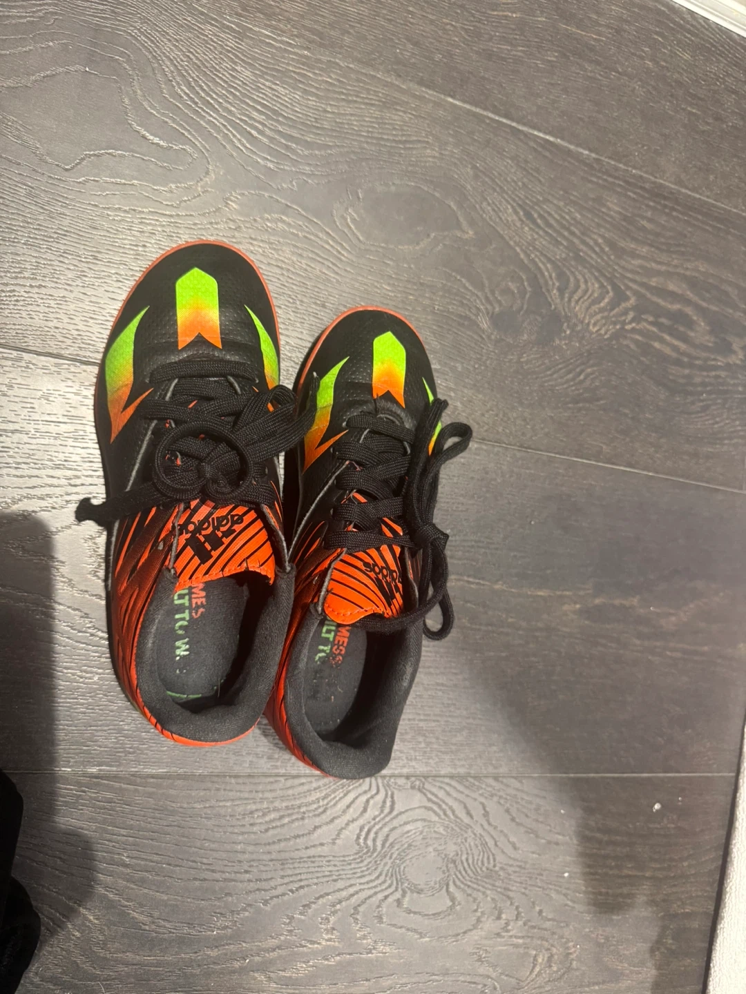 Selling a pair of Adidas Messi 16.4 TF soccer shoes. They're in good condition and ready for the field! The shoes feature a black, orange, and green colour scheme, with the Adidas logo clearly visible. Great for young soccer players