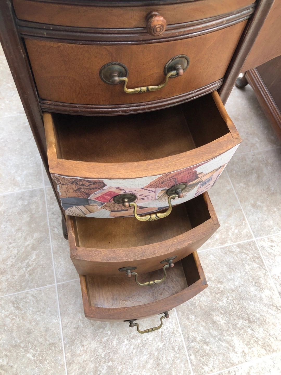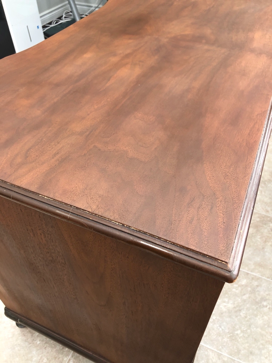 A little bit rustic and a little bit refinished. I kept the edges rough and original hardware to add to the character. 42” L x 23” D x 30.5” H